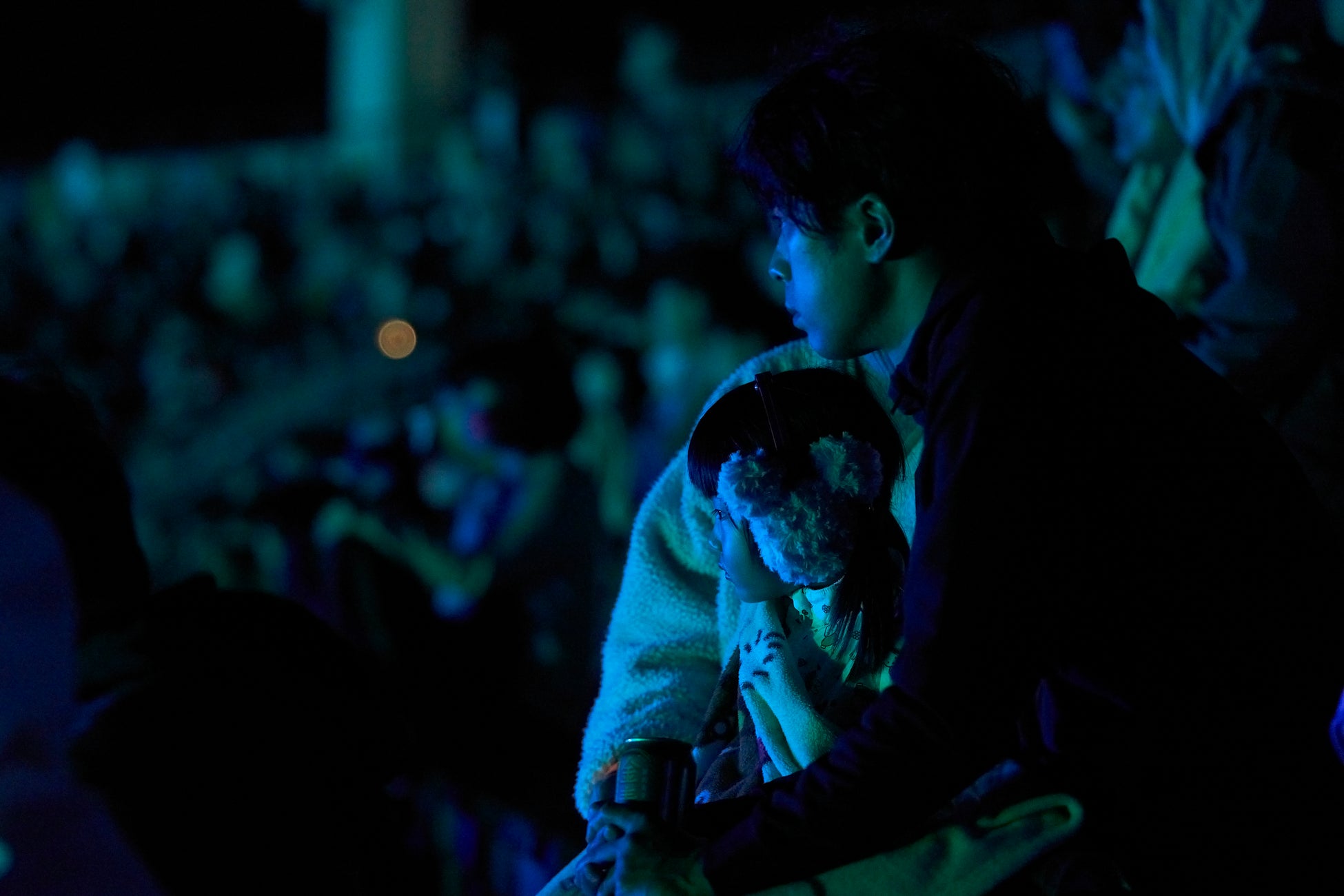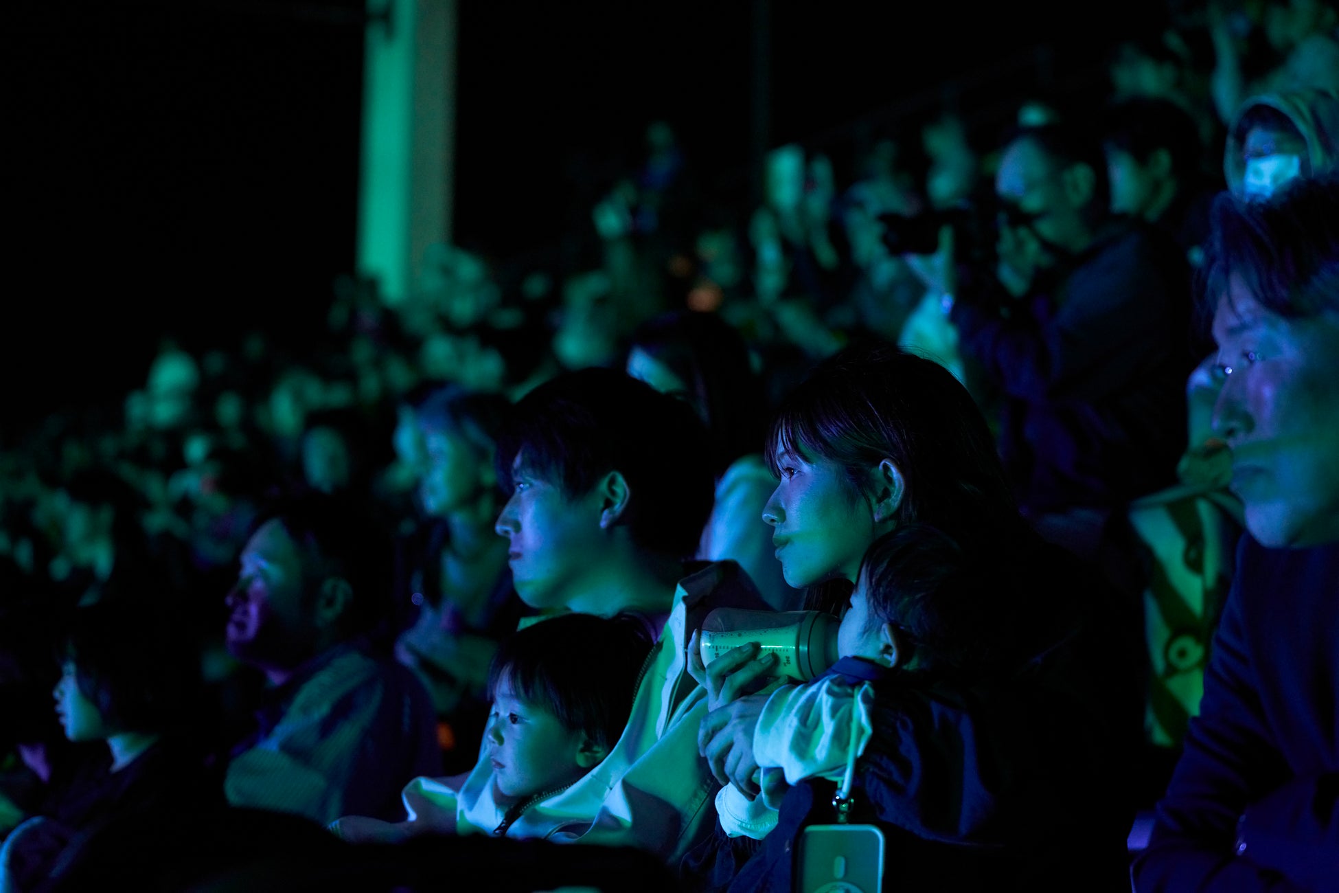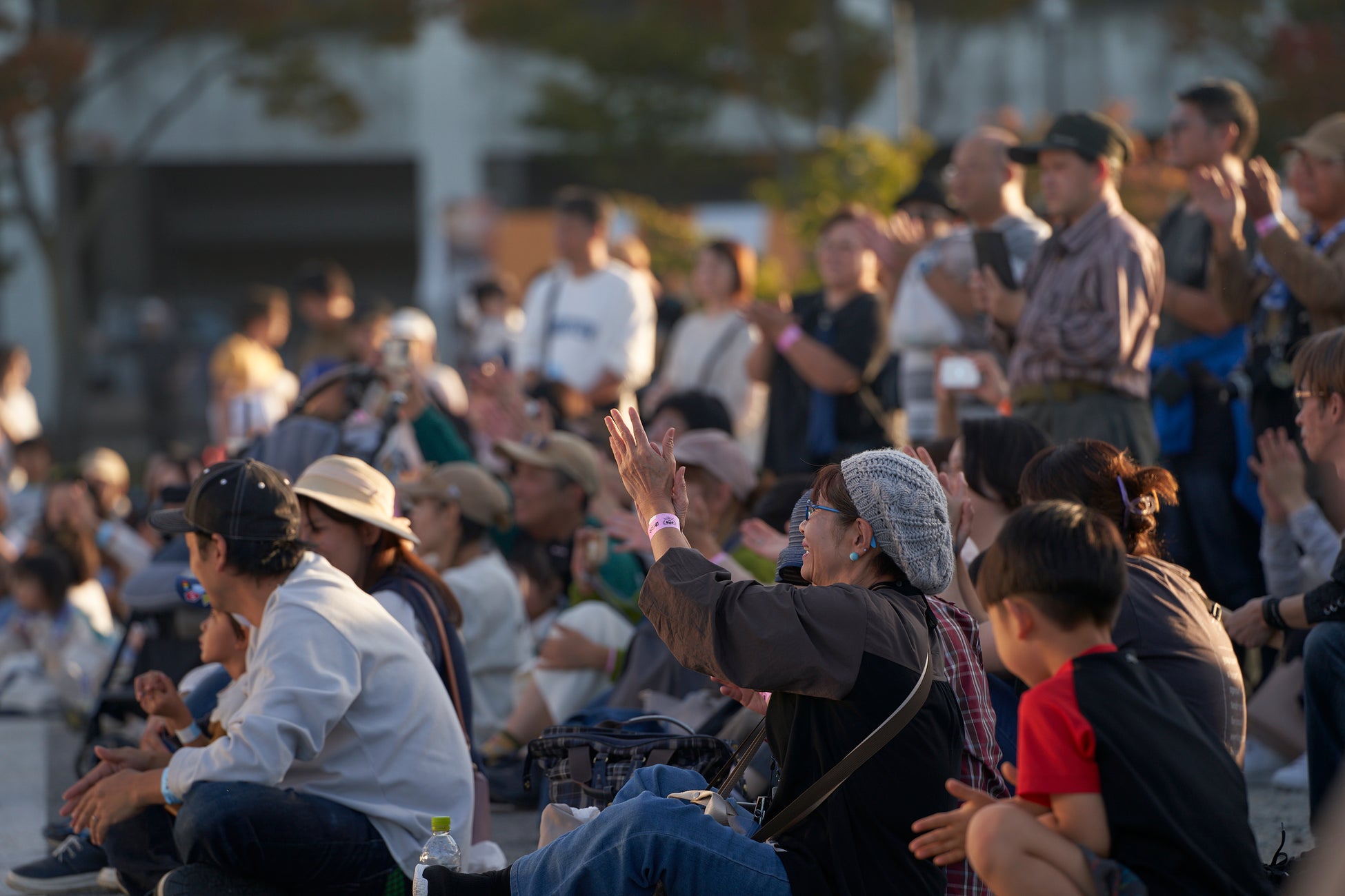 エピローグは戦国の世を生き抜いた女性たちの存在と未来への希望を壮大な連続花火で表現し、グランドフィナーレには来場者が参加して作り上げる「勝鬨花火(かちどきはなび)」の号令がかかります。「エイエイ!オウオウ!」の掛け声とともに光るライト等を来場者が掲げ、その演出に合わせてグランドフィナーレを飾る大輪の花火が打ち上がりました。