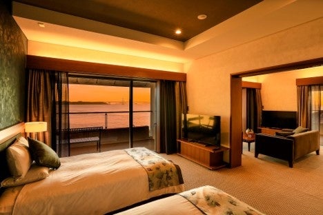 客室からは、夕焼けに染まる鳴門海峡の眺めと共に優雅な時間をお過ごしいただきます。