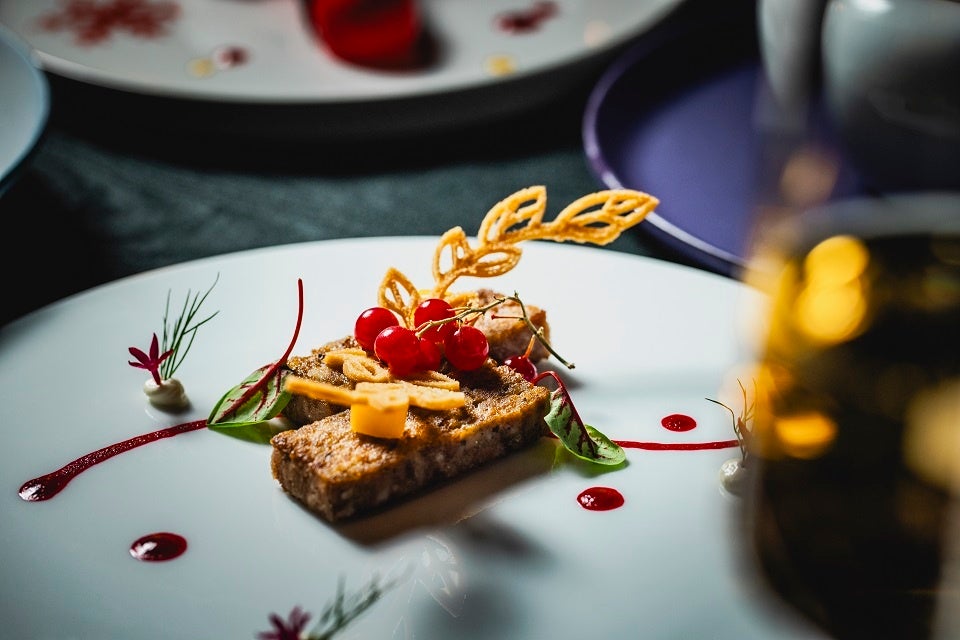 アミューズは、柔らかい身と濃厚な甘みが特徴のエゾアワビをサクサク食感の衣で包みキャビアを乗せた一皿。彩り鮮やかな前菜「クリスマスカラーの大根とマグロのフルール仕立て」へと続きます。七面鳥と豚のミンチ肉、ニンニク、エシャロットを合わせてしっとりと焼き上げた「七面鳥のパテ・ショー」はトナカイの角をイメージしたパイを添えて遊び心もプラス。甘い香りのアニスと生姜がアクセントとなりワイン等のお酒も進みます。身に弾力がありプリプリとした食感のオマール海老は、エビの殻を炒めて旨みを引き出した風味豊かなアメリケーヌソースで。メインディッシュには道産牛とフォアグラ、トリュフを贅沢に使ったロッシーニをご用意。上品で芳醇な味わいのマディラソースとの一体感をご堪能いただけます。締めを飾るのはサンタクロースを表現した可愛らしいデザート。マスカルポーネのムースに苺のコンフィチュールを挟み、甘酸っぱいオトナ味に仕上げました。すすきのの街並みを一望できる夜景きらめく空間で、美食と共にロマンチックなひとときをお楽しみください。