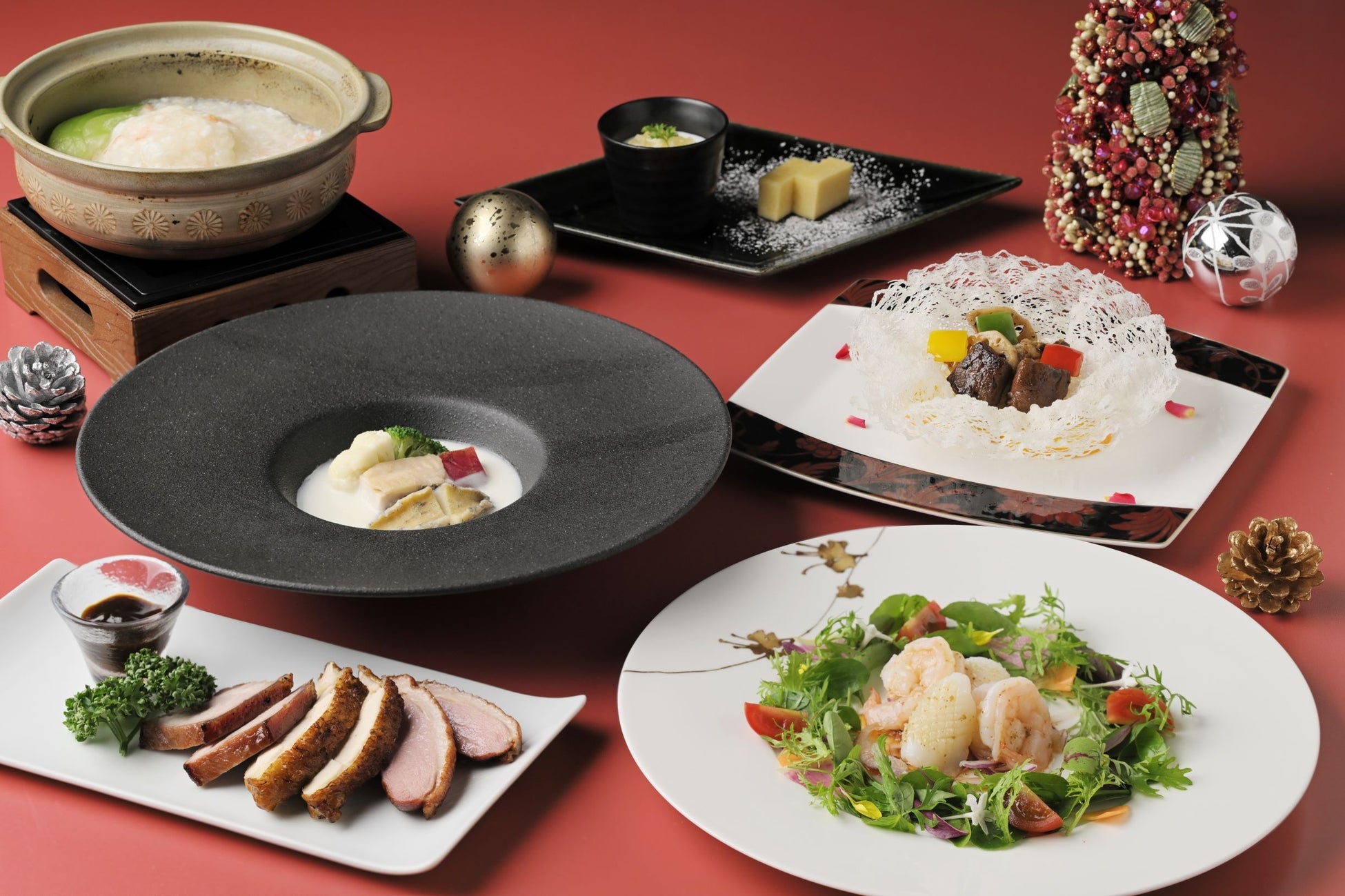 クリスマスのリースをイメージした彩り鮮やかな前菜。広東料理の焼き物 3 種のカッティングサービスや蟹肉の餡かけご飯は熱々の土鍋でご提供いたします。