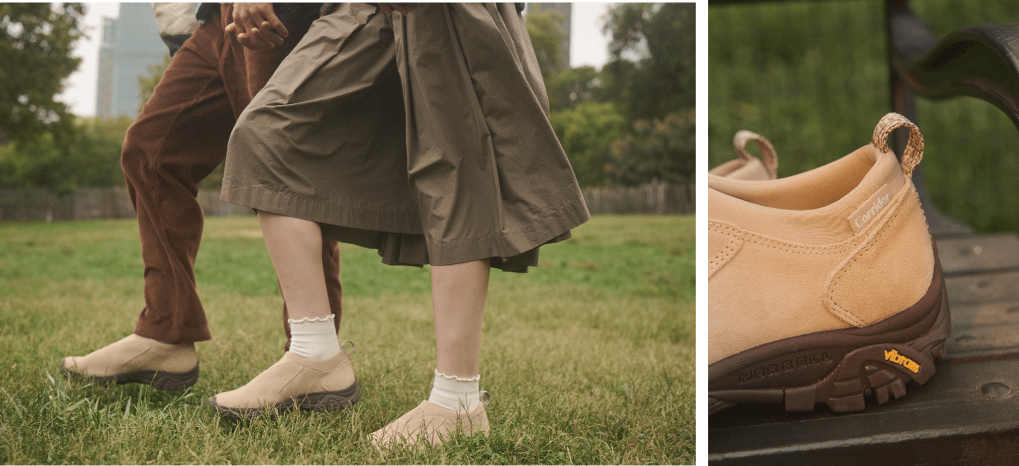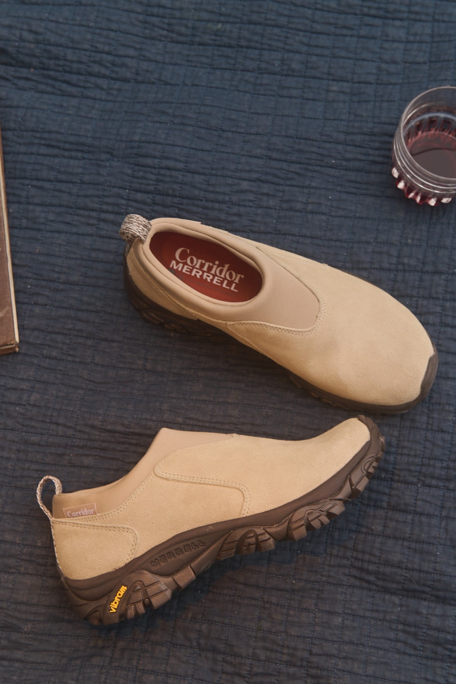 「Corridor」は2013年の設立以来、エシカルに調達された素材を用い、昔ながらのアメリカンスタイルに洗練を加えた、完璧な仕立てのアパレルを作り続けている、ニューヨーク/ブルックリン発のブランドです。この度「Corridor」とMERRELLのプレミアムコレクション「MERRELL 1TRL」との初コラボレーションアイテムとしてピックアップされた「MOAB WINTER MOC 3」は、長時間の移動にも十分なサポート性を発揮するハイキングにインスパイアされたパフォーマンスアウトソールに、日常を快適に彩るナチュラルなスエードをあしらったスリップオンデザインを採用した、まさに両社の理想が融合した1足です。