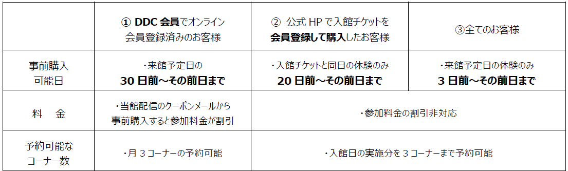 ログインすることで30日前から体験コーナーを事前購入することができます。