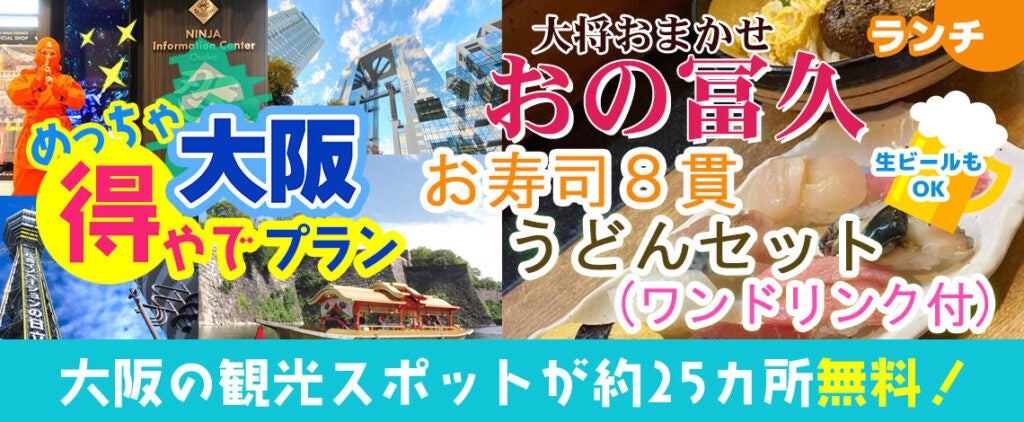 人気商品につき期間延長11/30迄「おの冨久」大将おまかせランチorディナー!大阪市内25以上での無料スポットを楽しめて+グルメがついた 大阪めっちゃ得やでプランを販売開始。