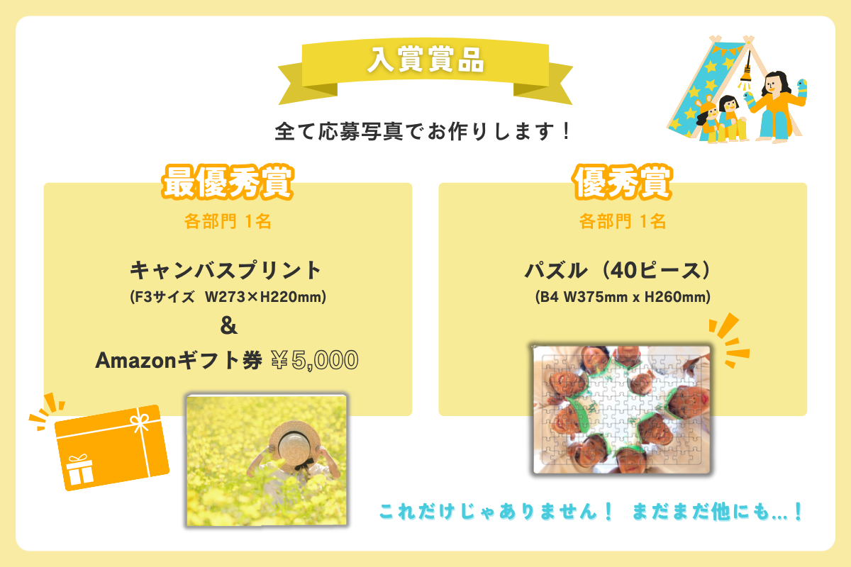 入賞者には、Amazonギフト券5,000円分や、応募作品でつくるパレットプラザのオリジナルフォトグッズ「キャンバスプリント」「パズル」など、豪華賞品をご用意しています。