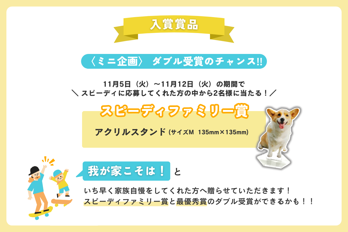 さらに、スピーディーファミリー賞として、2024年11月5日(火)~2024年11月12日(火)の期間にご応募いただいた方の中から、2名様に当選写真のアクリルスタンドをプレゼント!