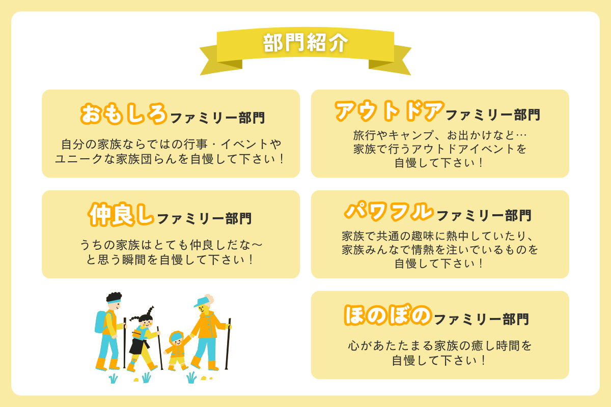 ご応募いただいた作品の中から、「おもしろファミリー賞 」「仲良しファミリー賞」「アウトドアファミリー賞」「パワフルファミリー賞」「ほのぼのファミリー賞」の5つの部門で、入賞者を選定します。