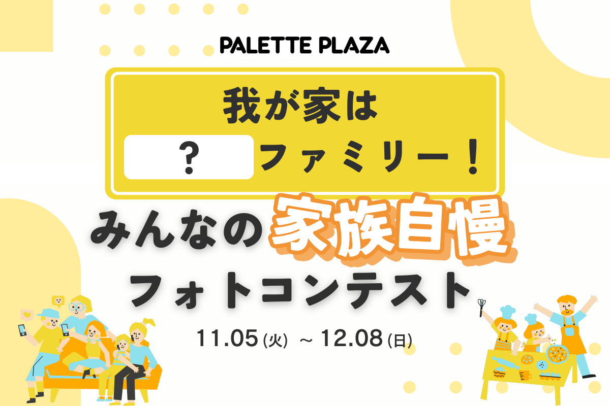 パレットプラザでは、写真を撮ることをもっと身近に、親しんでいただくことを目的に、『みんなの家族自慢フォトコンテスト』を開催します。家族での癒しのひととき、家族旅行での想い出、みんなで熱中しているものなど、家族とのかけがえのない瞬間を切り取った、とっておきの一枚をご応募ください。