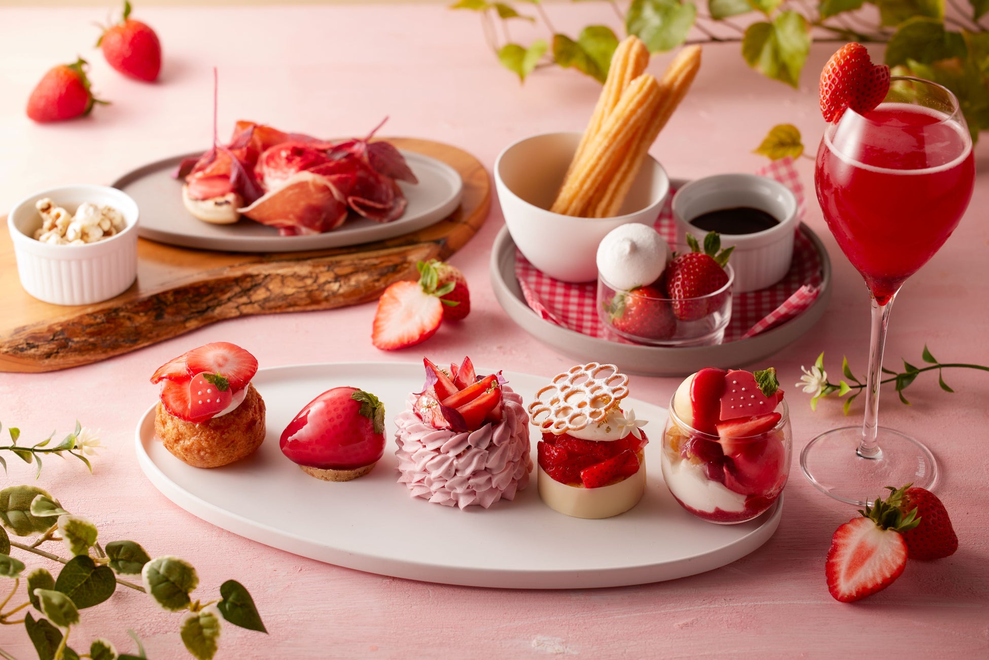 いちごの甘酸っぱさと相性抜群のチョコレートやカスタードなどの食材を組み合わせたスイーツから、エディブルフラワーやハーブなどで飾り付け上品さと華やかさのあるフェミ二ンな見た目のスイーツまで、全6種類をラインアップ。冬が旬の新鮮ないちごもそのままお召し上がりいただけます。さらに、セイボリーまでストロベリーパウダーをまぶすなど、まさにいちご尽くしで、いちご好きにはたまらないアフタヌーンティーです。