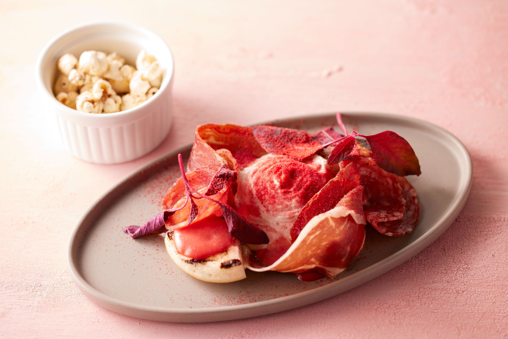 濃厚なフロマージュブランムースを中心に、ハモンイベリコ、イタリア伝統ソーセージ―モルタデッラ、米粉パングリル、カクテルソースを盛り付け、ストロベリーパウダーをまぶしました。芳醇で豊かな風味のトリュフバターで味付けした、 香り高い贅沢なポップコーンを小皿で添えました。