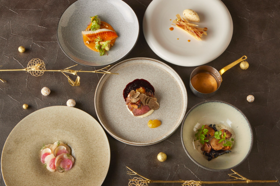 年末年始の期間にふさわしい、毛ガニやキャビア、金目鯛などの豪華食材を使用した特別コースをご用意しました。贅沢に毛ガニを使用した「毛ガニ ラクサ風 フレッシュハーブ、りんごのグリル」は、グリルしたりんごを添えることで、甘みと酸味が加わり、全体の味わいに爽やかなアクセントが加わり、スパイスとココナッツミルクの豊かな香りが漂う、異国情緒あふれる贅沢な一皿に仕上げました。また、神奈川県産の金目鯛を串焼きにし、余分な油を落としながら焼き上げた「神奈川県産金目鯛の串焼き 焦がし牛蒡とマグロ節のブイヨン」は、マグロ節を使った香り豊かなソースとともに、金目鯛の繊細な味わいをお楽しみいただけます。年末年始のひとときに、特別感溢れる豊かな味わいをお楽しみください。