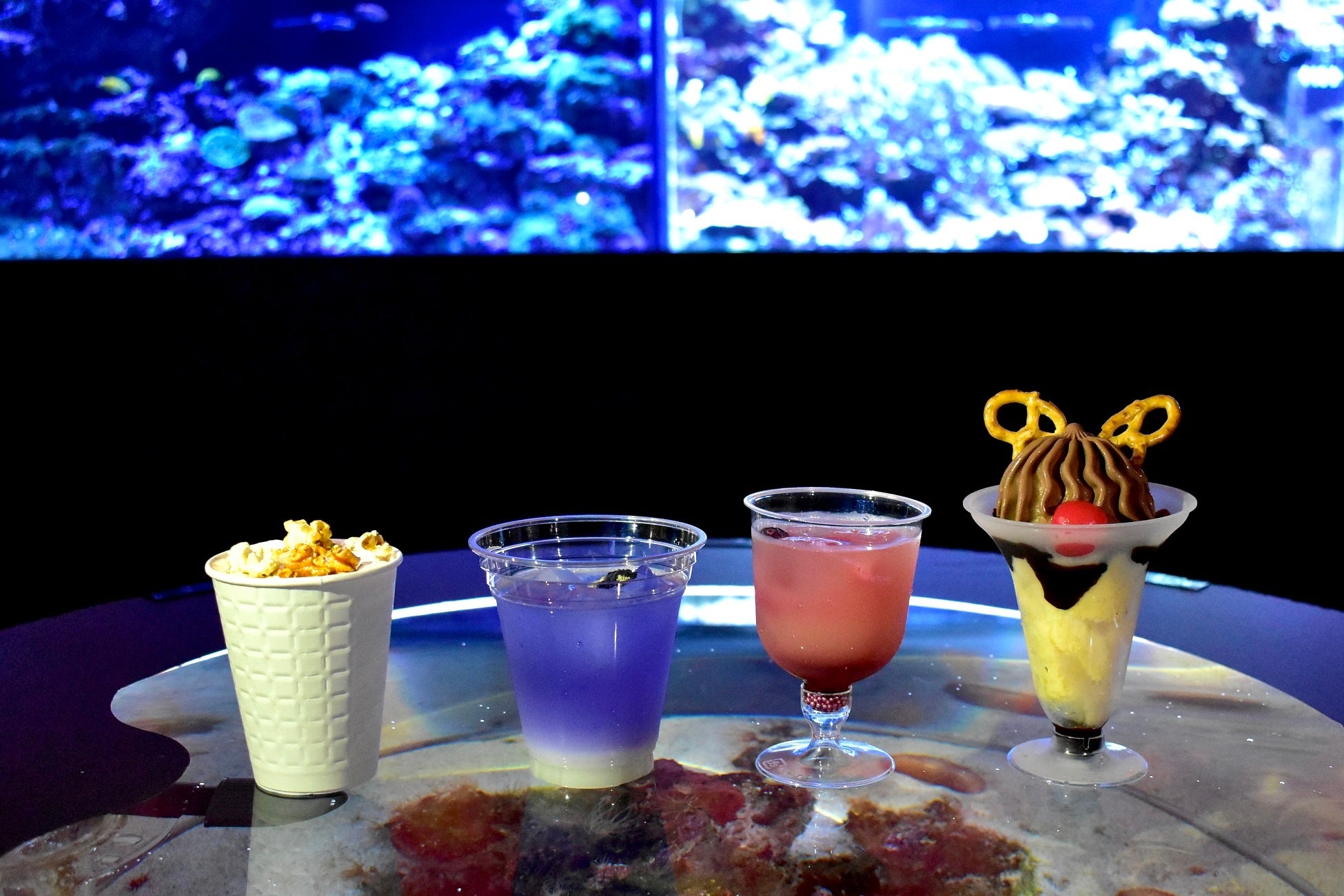 カウンター横に連なる発光サンゴの水槽とクリスマスオーナメント、そしてリボンの映像で大胆に彩られたカフェバー空間。約3分間に一度、満天の星空につつまれるショータイムもあり、お好みのドリンクを片手にくつろぎの時間をお過ごしいただけます。館内でお持ち歩き可能なイベントメニューは、色合いも華やかなベリー風味のアルコールドリンク、“トナカイ” に似せたパフェなど4種類をご用意しました。