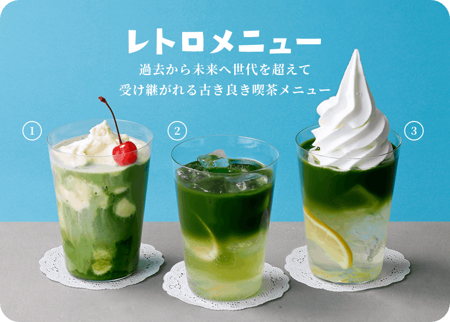 アートアクアリウム美術館の入場券とセットになった、お~いお茶ミュージアムカフェのドリンクチケットでは、3種類のレトロメニューからお好きな1杯をお選びいただけます。