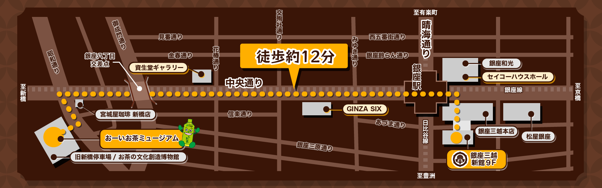 アートアクアリウム美術館 GINZAのある銀座三越から、お~いお茶ミュージアムまでは徒歩12分ほど。本プランをお楽しみいただくなかで、銀座のさまざまなお楽しみスポットに立ち寄ってみるのはいかがでしょうか?