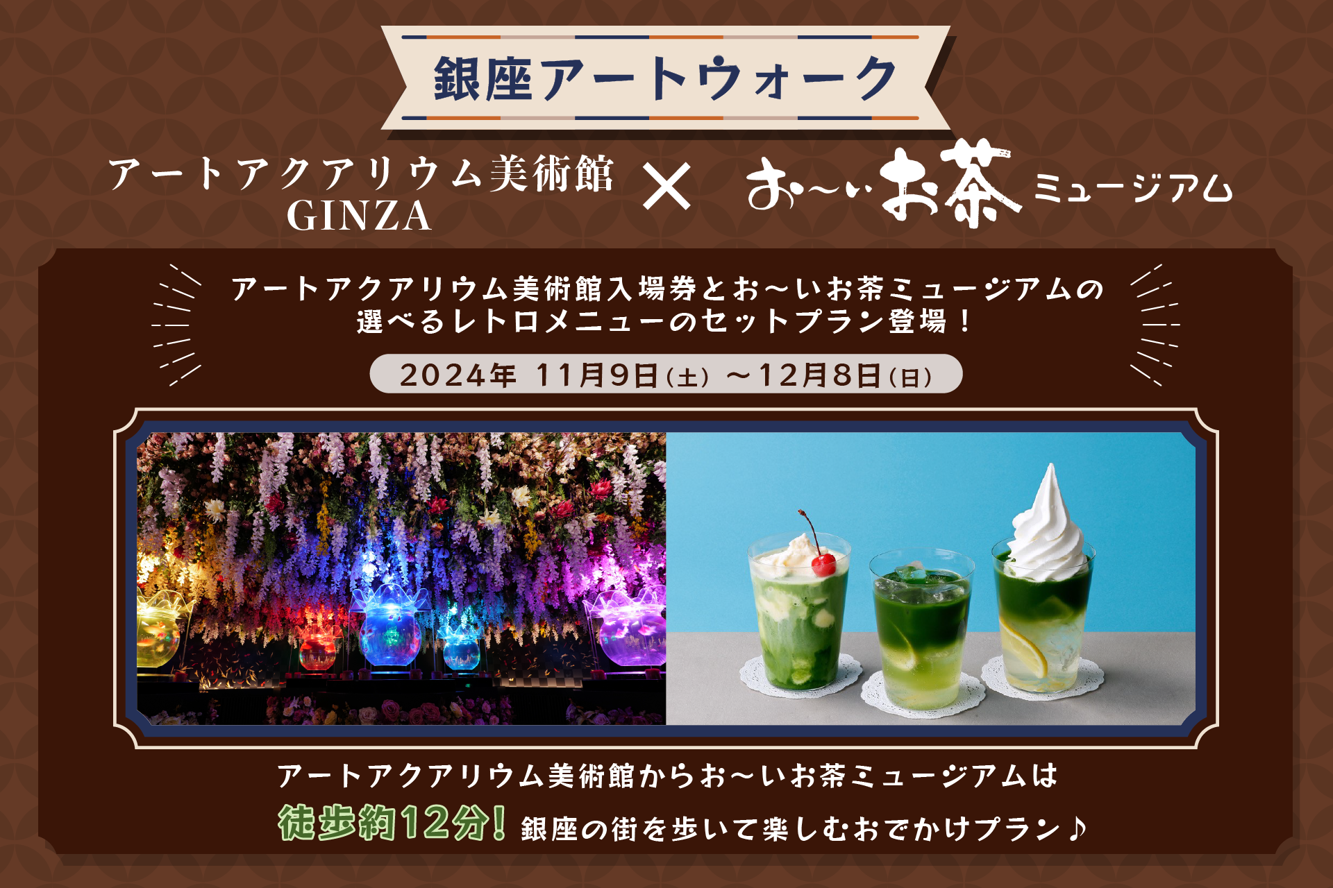 アートアクアリウム美術館 GINZAの入場券と、お~いお茶ミュージアムカフェレトロメニュー(通常価格650円~850円)のお好きなドリンク一杯がセットになったお得なチケットです。