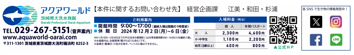 開催日:2024年12月21日(土) 18:00~20:00 (最終入場19:00) ◆アシカと記念撮影会付ペアチケット:5,000円 ※10組限定 大人ペア入場券、アシカと記念撮影会参加権(2名様分)がセットになった12/21限定特別チケット https://www.asoview.com/channel/ticket/qk2rlVYZU2/ticket0000035470/ ◆イルカと記念撮影会付ペアチケット:5,000円 ※10組限定 大人ペア入場券、イルカと記念撮影会参加権(2名様分)がセットになった12/21限定特別チケット https://www.asoview.com/channel/ticket/qk2rlVYZU2/ticket0000035469/ ※アシカ、イルカとの撮影会には最大5名様まで参加可能です。追加参加となる方も入場券が必要となり ます。 ※お客様がお手持ちのカメラやスマートフォン等を使用してスタッフが撮影を行います。 ◆クリスマスケーキ付ペアチケット:5,000円 ※10組限定 大人ペア入場券、クリスマスケーキ2個がセットになった12/21限定特別チケット https://www.asoview.com/channel/ticket/qk2rlVYZU2/ticket0000035471/ ◆ナイトバックヤードツアー付チケット、一般入場チケットも好評発売中 ※チケットはWebチケット「asoview!」での販売となります。年間パスポート、前売り券、招待券でのご 入場はできません。 ※スーベニアショップ「モラモラ」、コレクターズショップ「ガレオス」、リラックスカフェ「マーメイ ド」は営業いたします。フードコートは営業いたしません。 |
