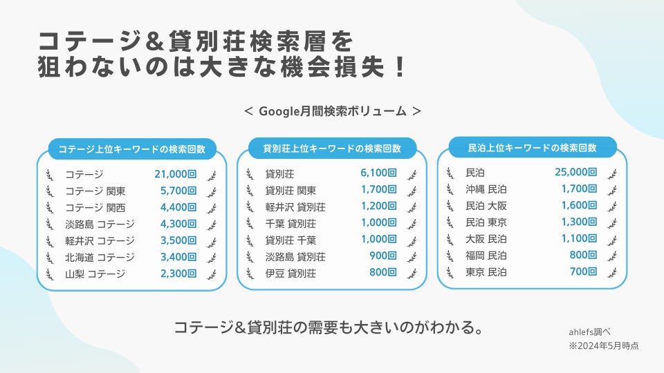 TABILMOは、Googleなどで「地域名 コテージ(貸別荘)」と検索した際に、検索結果の上位に表⽰される”SEOに強い”一棟貸し専門の宿泊予約サイトです。