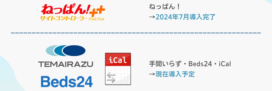 2024年7月に「ねっぱん!サイトコントローラー++」を導入しました。これにより、宿泊予約サイトの在庫・予約情報を⼀括管理が可能に。空室管理の負担を減らすことで、オーナー利便性の向上およびさらなる新規オーナーの獲得を目指します。