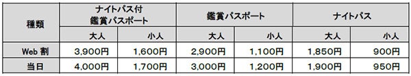 上記ナイトパスまたはナイトパス付鑑賞パスポートのとおり