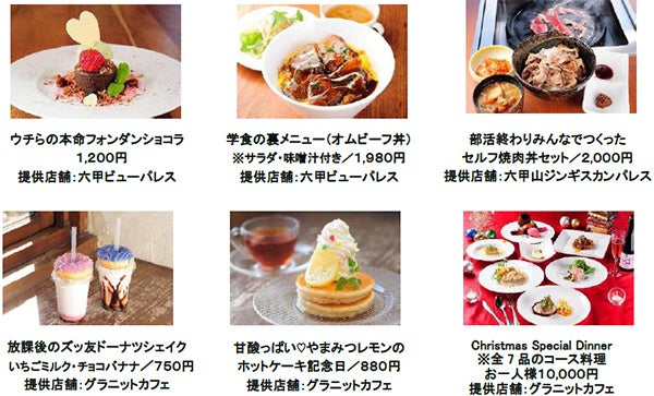 六甲ガーデンテラス内の3つの飲食店舗では、イベント期間限定で、青春をイメージした様々なメニューをご用意しています。各店舗で、神戸・大阪の眺望が楽しめる座席を多数ご用意しておりますので、絶景と共にお食事をお楽しみください。また12月24日(火)・25日(水)の2日間は、エリア内のレストラン・グラニットカフェでクリスマスディナーをお楽しみいただけます。標高880mから臨む「1,000万ドルの夜景」とともに、シェフ考案のクリスマスにピッタリの華やかなメニューをご賞味ください(完全予約制。イベント特設HPより現在予約受付中)。