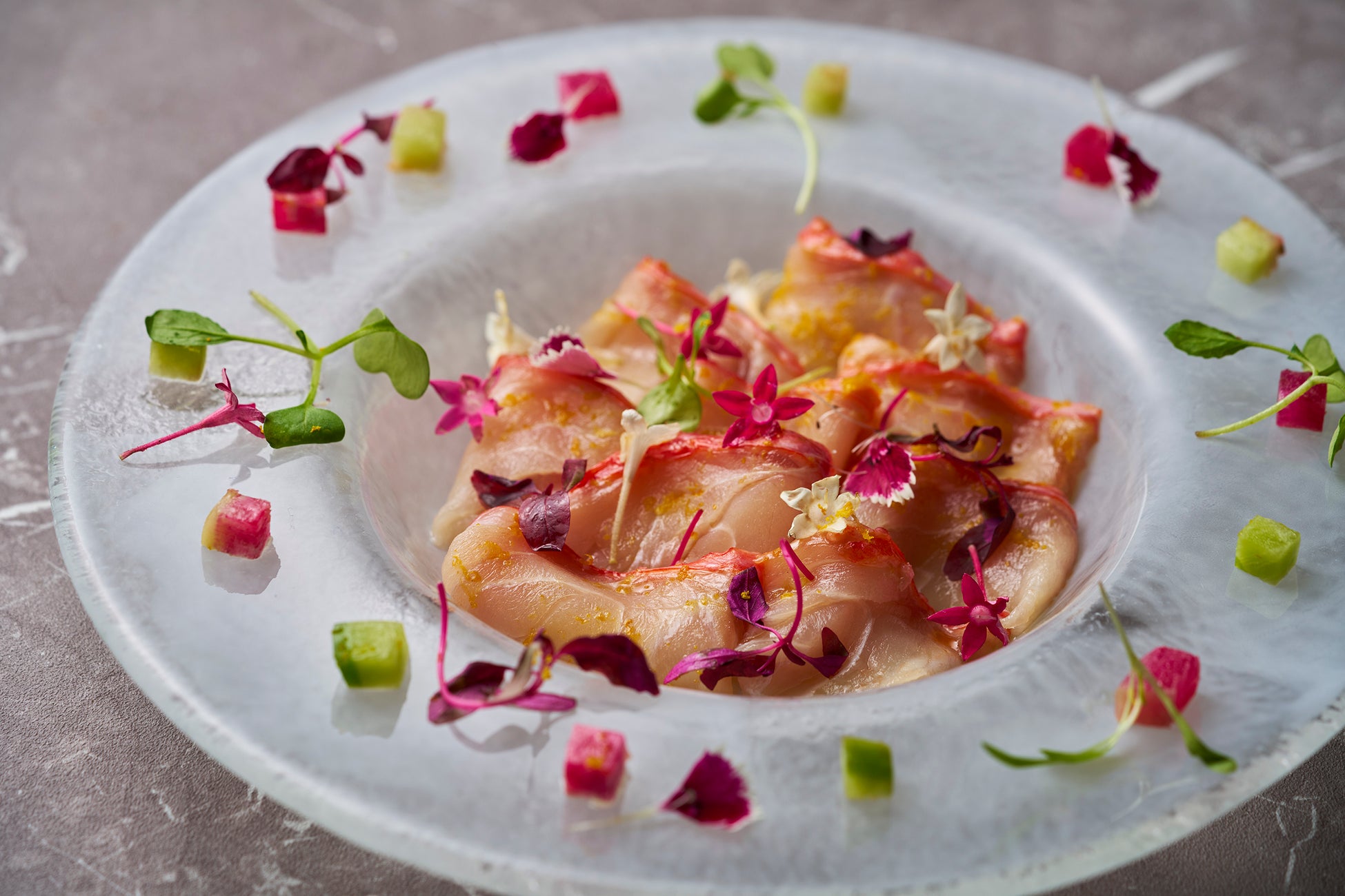 華やかな金目鯛カルパッチョ、大和橘と浅利ソースで彩る奈良の味覚