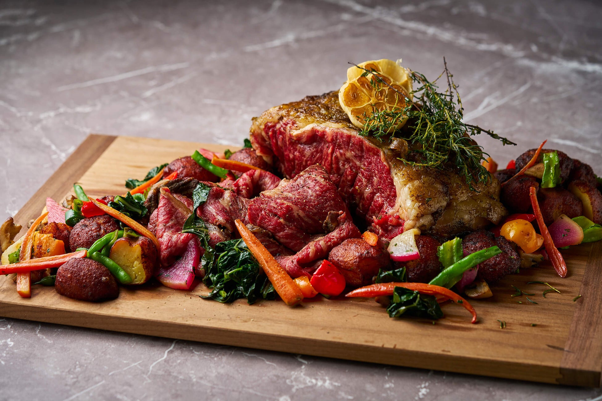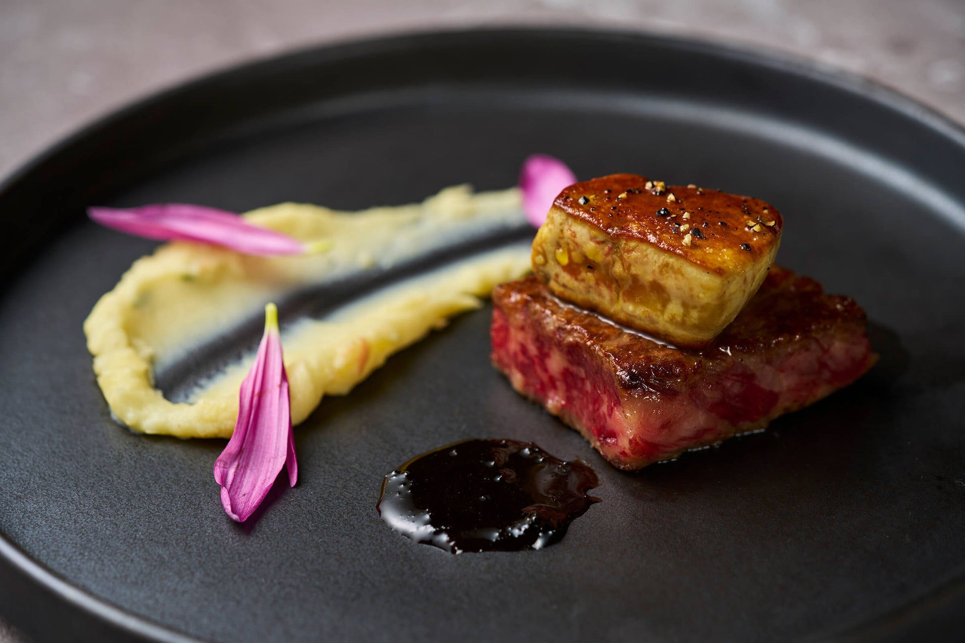 じっくりと大和茶と焼いたコンブでマリネされた国産牛サーロインは、香りと旨味が豊かに引き立ちます。仕上げに味わい深い赤ワインソースをたっぷりとかけると、ワインの芳醇さが肉の風味と絶妙に調和し、和と洋の魅力が詰まった奥深い味わいとなります。