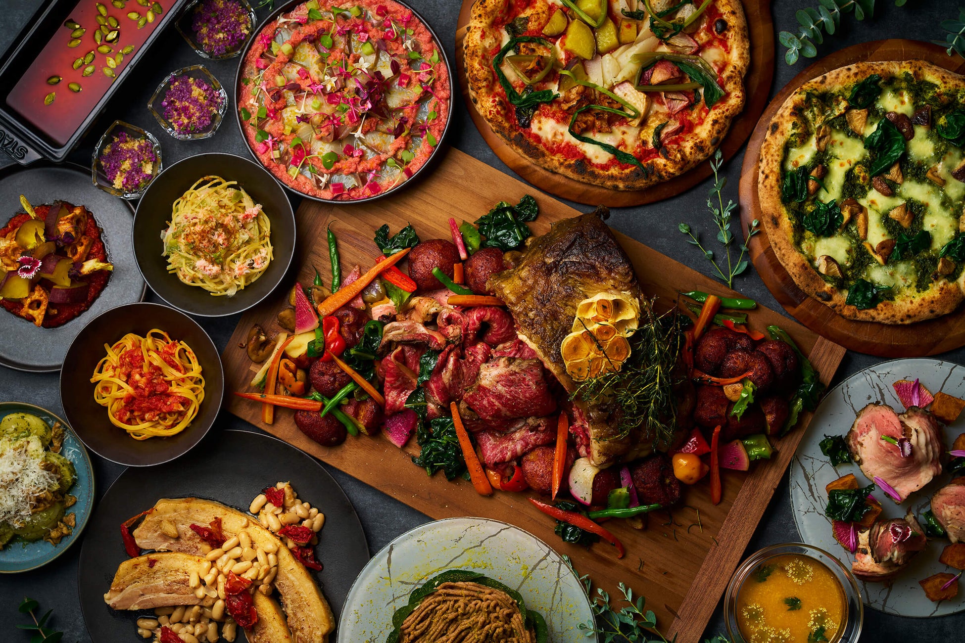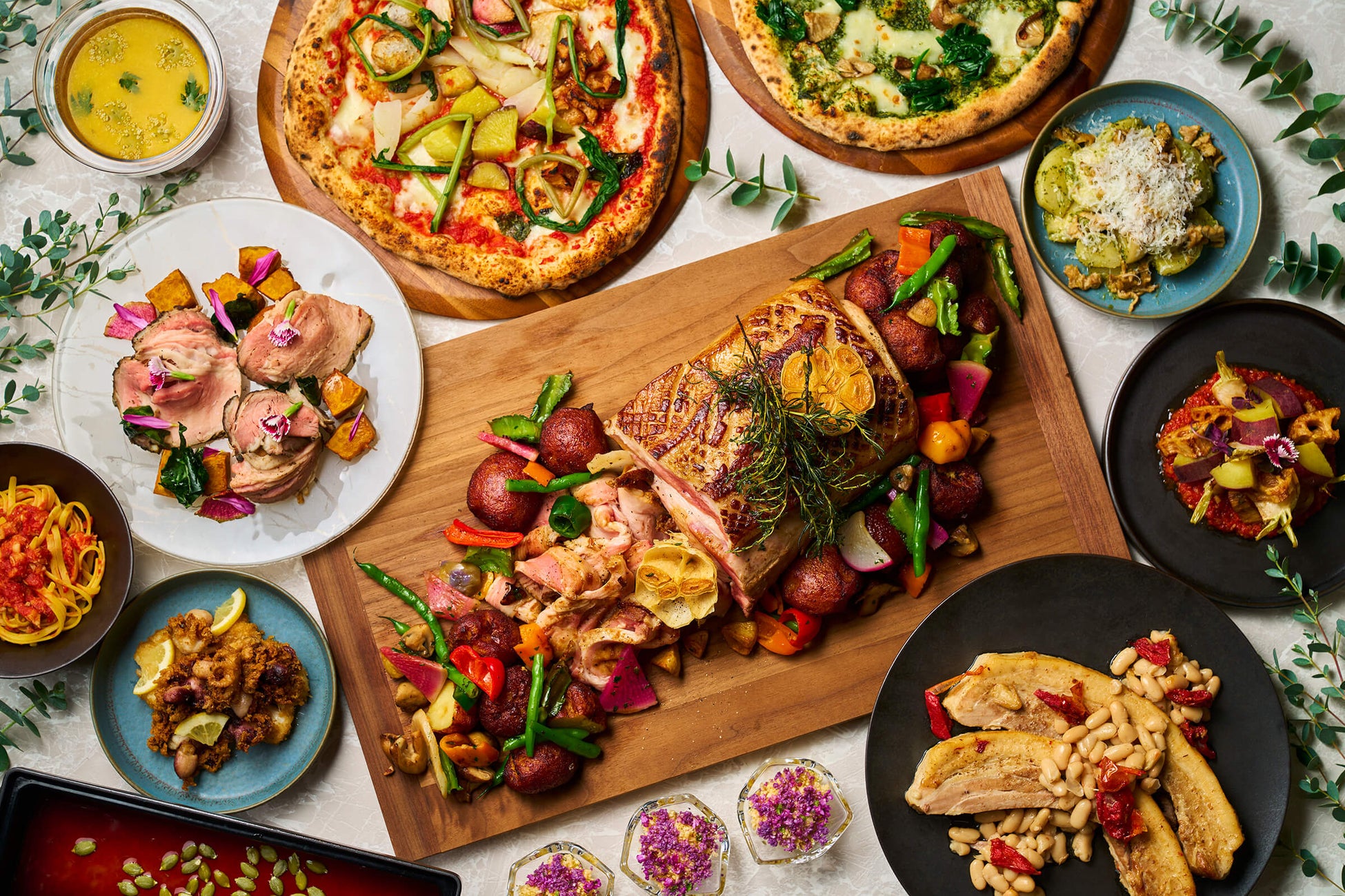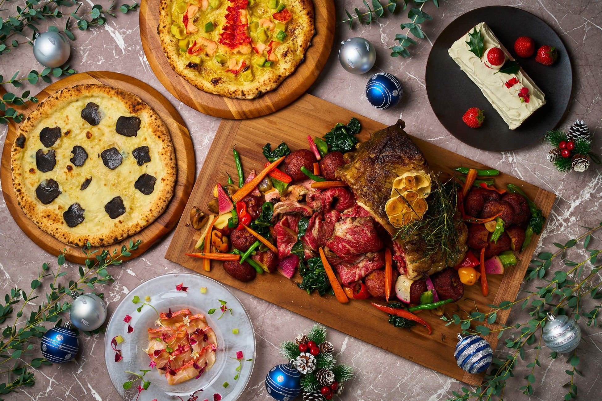 奈良県産のスペルト小麦を用いたピザ生地に、4種のチーズが織りなす濃厚なクワトロフォルマッジ。香り高いトリュフと古代の甘味「甘葛煎(あまづらせん)」をプラスした風味豊かなピザと、マドラス風味で仕上げたオマール海老とアボガドの大和橘薫るピザ、それぞれの味わいをこのクリスマスだけの特別なアレンジで、豪華なピザをお楽しみいただけます。