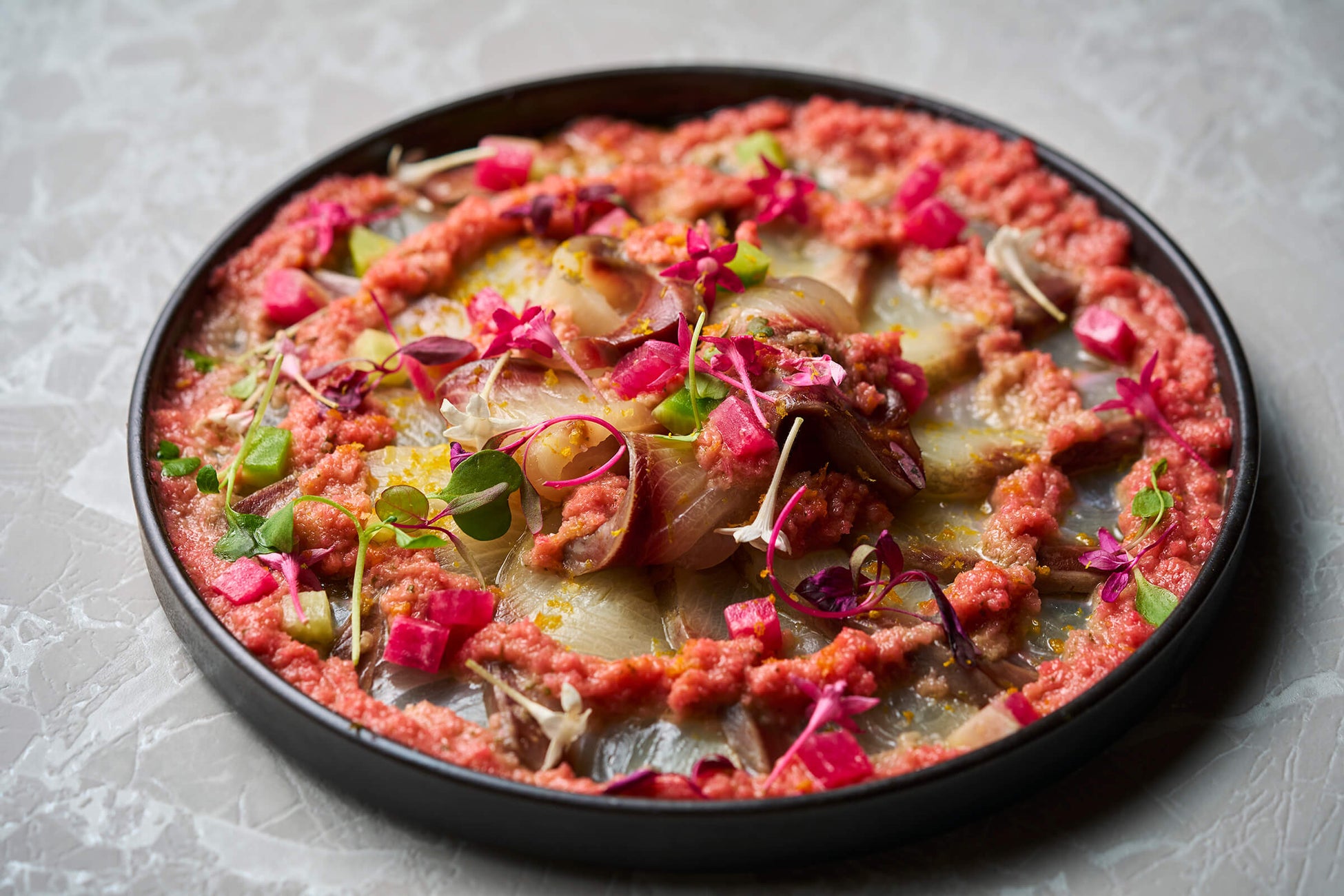 スモークした鰤のカルパッチョ 紅芯大根のラヴィゴットソース