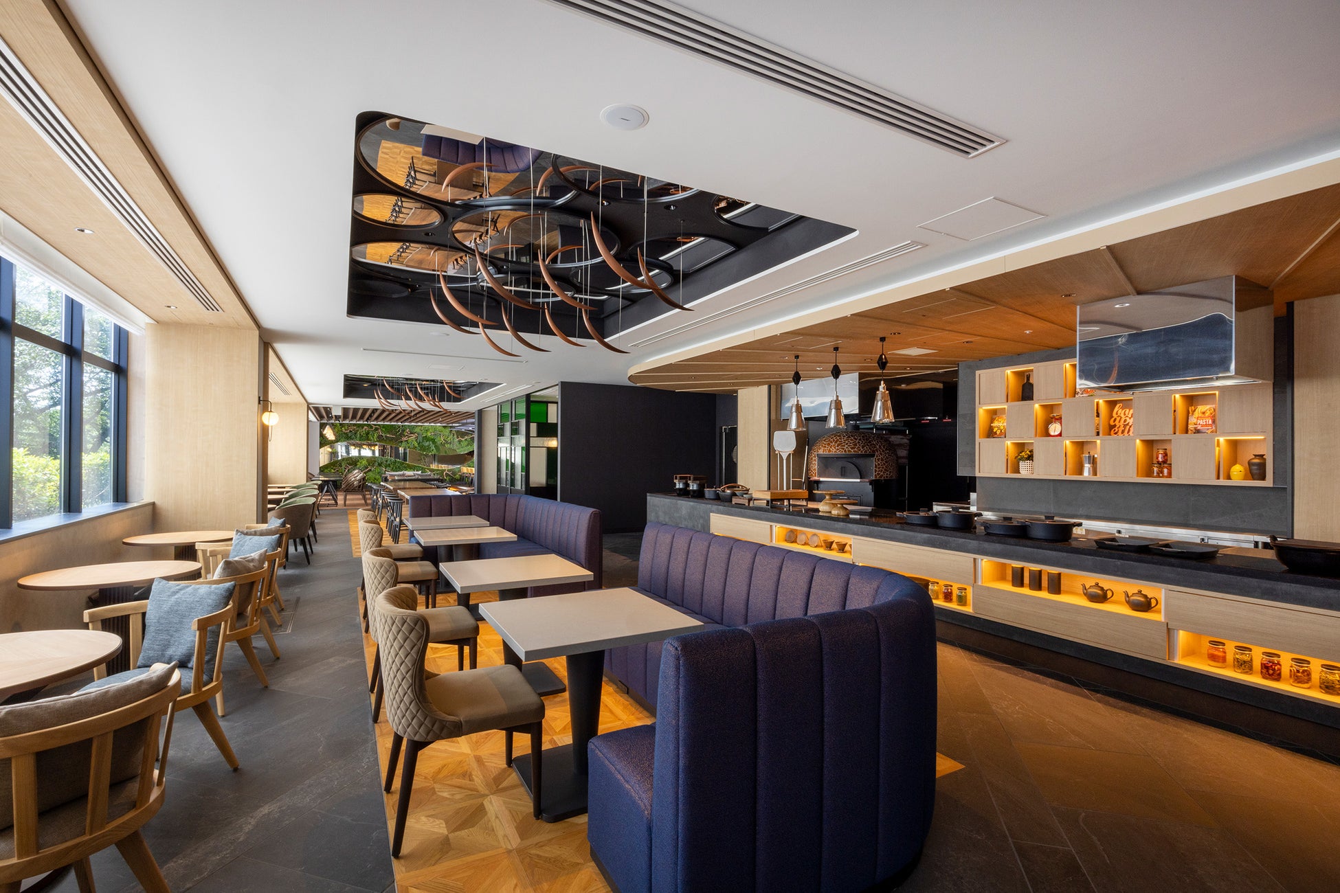 “スローフード”がコンセプトのレストラン「トラットリア・ポンテ 奈良」は、ピザ窯を備えた本格トラットリア。奈良の土地に根差した食材を多く活用した、本物嗜好でありながらシンプルなイタリア料理をご用意しております。デザインコンセプトを「Upside Down Garden」に据え、奈良の穏やかな自然を物語る内装に。木の温かみを感じられるレストランで、繊細に表現される新しい奈良の味をご堪能ください。
