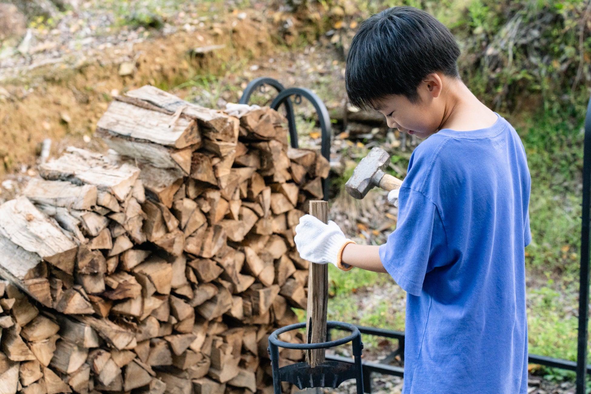 焚火体験を希望されるお客様には、専用の焚火台・薪1束(約3kg)・着火剤をお渡しします。着火の方法はスタッフからご説明しますのでお子様や女性、アウトドアに不慣れな方でも簡単に始めていただきます。