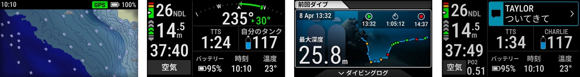 ダイブログ記録(最大200)、水面でのGPSサポート、エントリー/エキジットポイントの自動記録、ダイビングプラン、減圧理論(Bühlmann ZHL-16c)、淡水/海水/カスタム、セーフティーストップ、ディープストップ、ダイブサイトへのナビ(沈没船・サンゴ礁など)ダイブビューマップ、警告アラート(サウンド&バイブレーション)など |