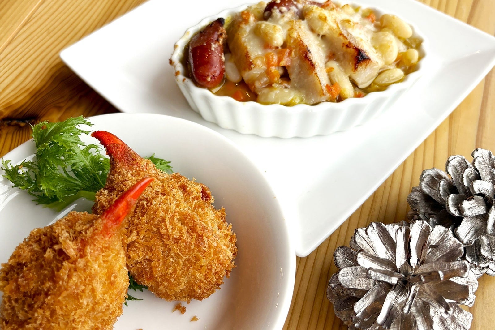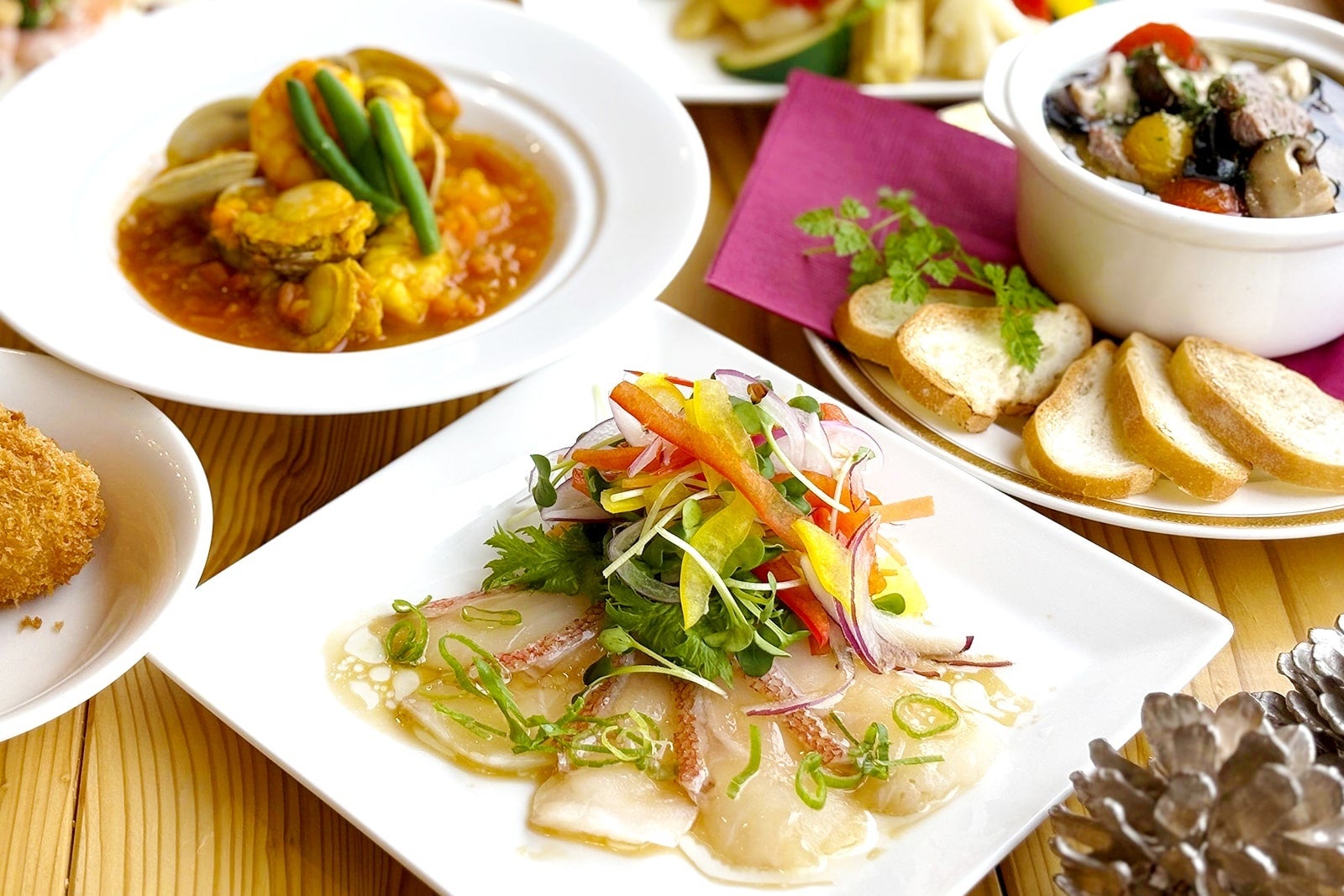 オマール海老のクリームコロッケやポルチーニ茸のクリームフィトチーネ、ほっこりと体温まるチャウダーなど、寒い冬にぴったりのバラエティ豊かなメニューをご用意いたしました。冬季限定の洋梨を使用したキャラメルクリームロールケーキなど、自慢のデザートもご一緒に、冬の味わいをお楽しみください。