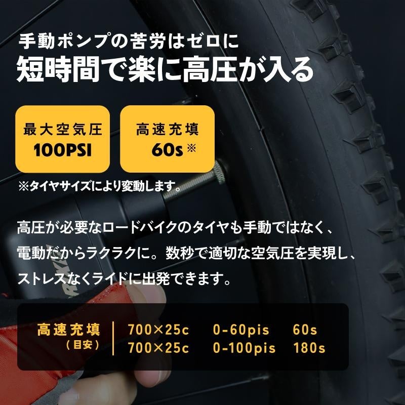 数秒で適切な空気圧を実現し、ストレスなくライドに出発できます。