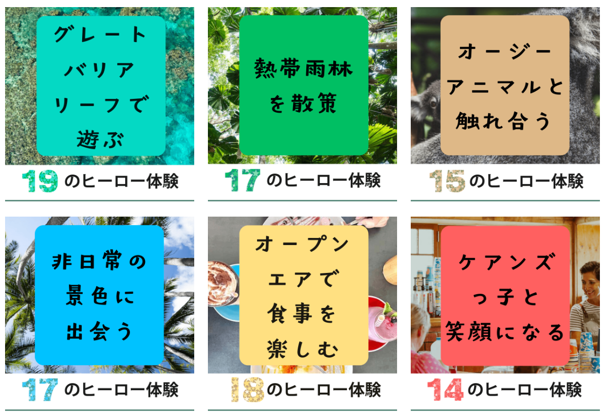 おすすめの「100のヒーロー体験」では6つのカテゴリに分け、世界で唯一2つの世界遺産が出会う場所であるケアンズならではの体験から、グレートバリアリーフや世界最古の熱帯雨林などの世界遺産をはじめ、オーストラリア固有の動物や文化、常夏リゾートでの非日常の世界など人に伝えたくなるような物語、一生心に残るような思い出になる体験をご紹介します。