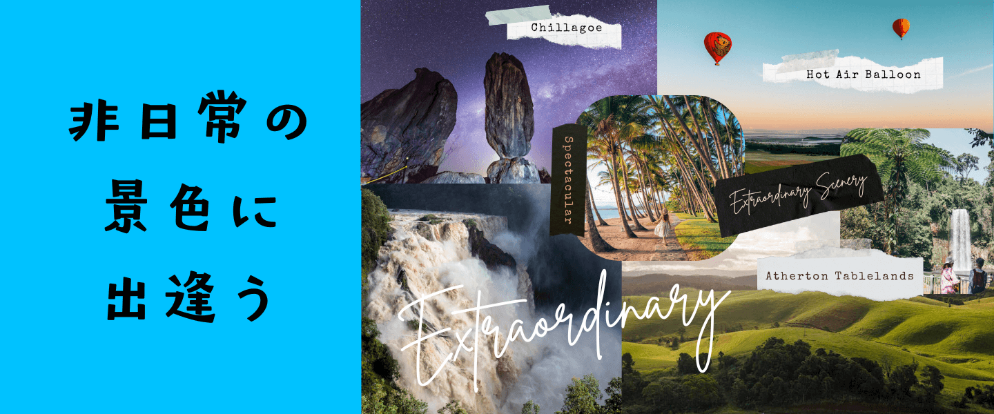 雄大なオーストラリアの大地を空から見下ろし、朝日に照らされながら地上を跳ねるカンガルーも見られる「熱気球で空中散歩」、山と海とケアンズの街並みが見える上空から時速200キロで豪快にスカイダイビングで「大空から舞い降りる」、大迫力な125mの高さを誇る「バロンの滝を眺める」など、大迫力のアクティビティのほか、キュランダ村から階段を降りていくと個性的な小さなお店が集まる不思議な空間「キュランダ・オリジナル・レインフォレスト・マーケット」、広大な土地に牛や馬が放牧され、様々なトロピカルフルーツのファームが広がる「アサートン高原」で過ごすなど、非日常の景色や体験も、年中常夏のケアンズだからこそ思い切り楽しめる体験です。