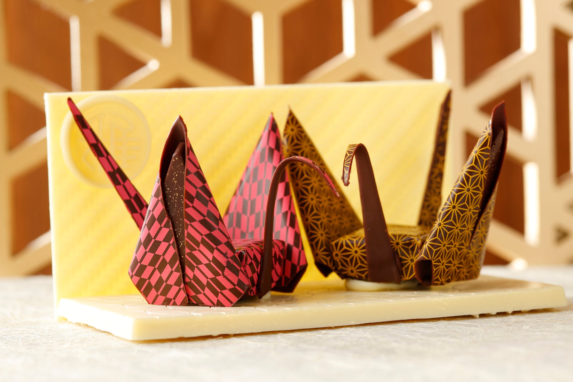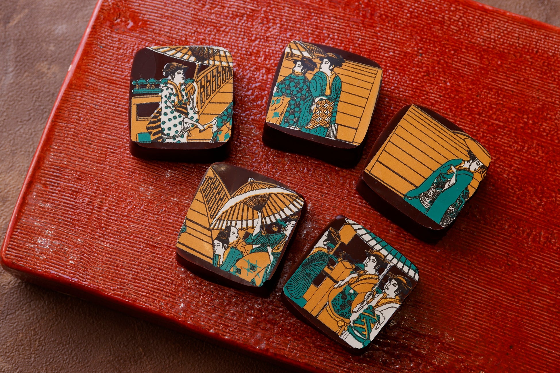 ホテルの天井や壁を彩る花鳥画や美人画、江戸時代の参勤交代をモチーフにした彫刻からのひとコマを切り取った大名など、8つの景色をショコラに写し取りました。