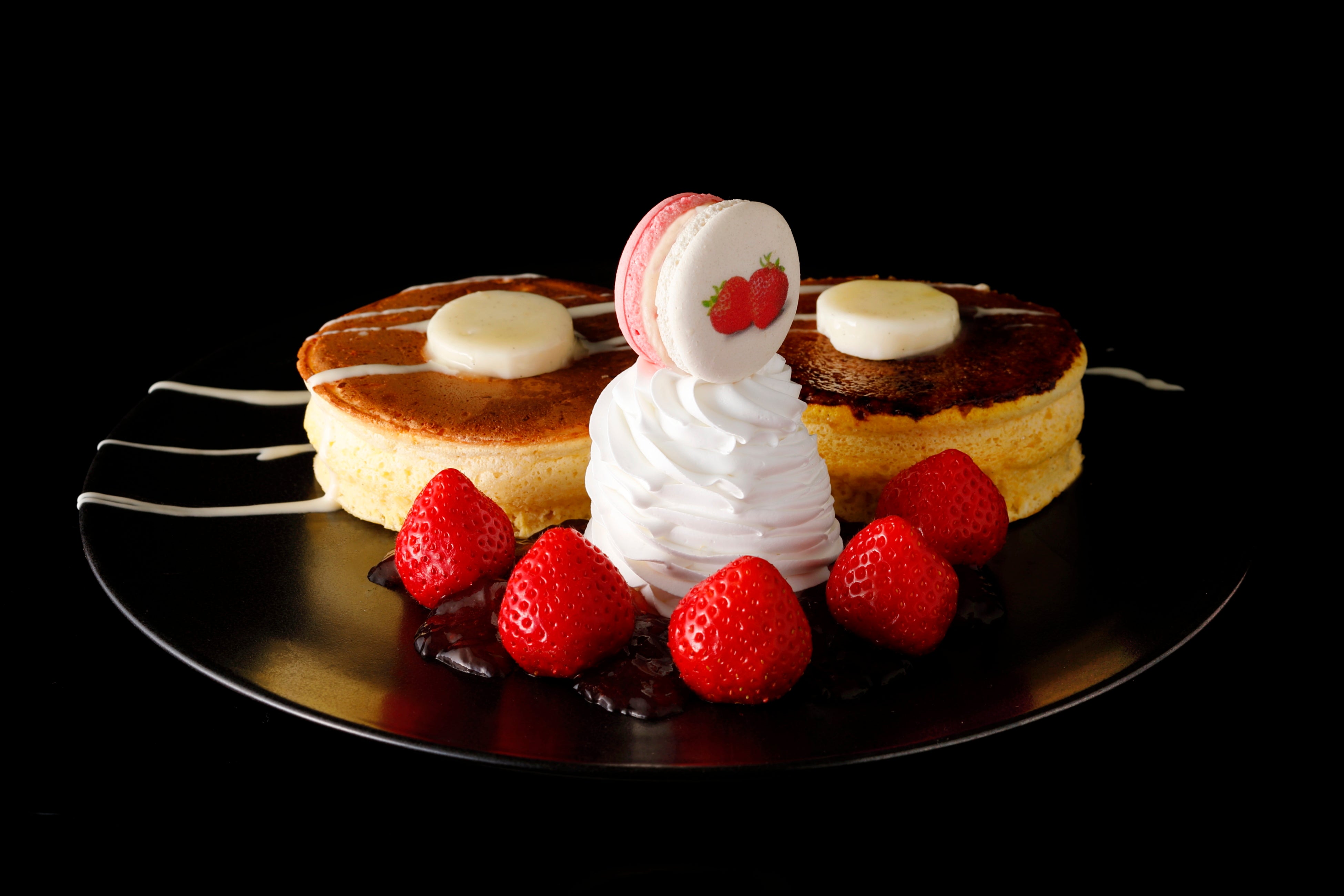 イタリア産リコッタ・クリームチーズ・マスカルポーネの3種類のチーズをブレンドした生地に、ホテルオリジナル雑穀「ホワイトシリアル」と乳酸菌を加えることで、極上の“ふわっふわ”な食感を実現しつつ、身体にやさしく仕上げたホテル特製のパンケーキ。豆乳ガナッシュと豆乳バターでさっぱりと仕上げたパンケーキと、表面をキャラメリゼで仕上げたパンケーキ、2つの異なる味わいと食感を出来立てでお愉しみいただけます。見た目も可愛らしく華やかなマカロン、パンケーキに添えたジュレにもあまおうを使用した、“あまおう尽くし”の一皿です。