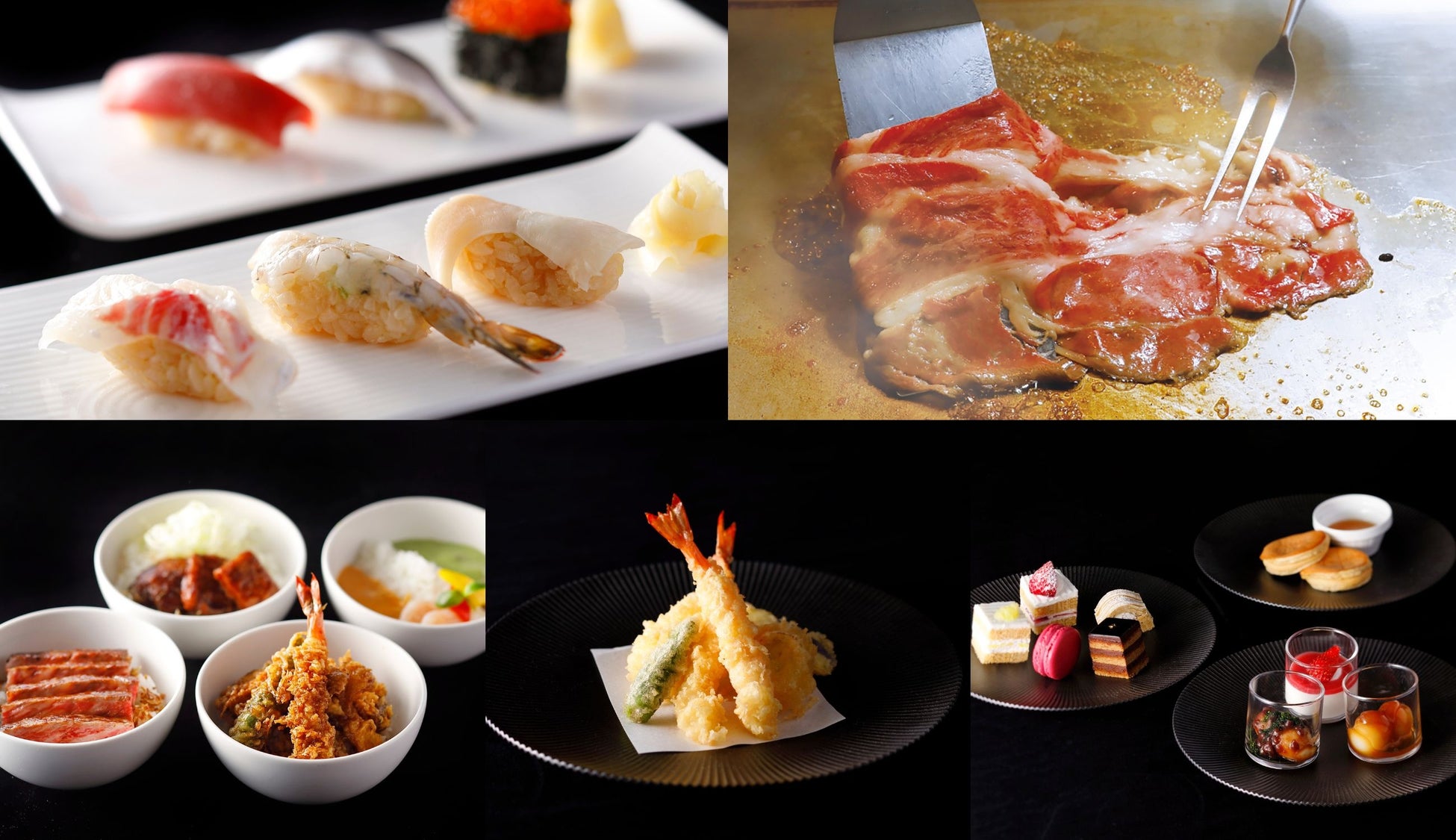 中央のオープンキッチンからは、ホテル伝統のローストビーフや、オーダーを受けて職人が握るお寿司、揚げたての天ぷら、鉄板焼など、すべて出来立てでご提供いたします。王道メニューに加えて、クリスマス限定メニューもご用意しているので、ホリデーシーズンならではの多彩なメニューをお楽しみください。