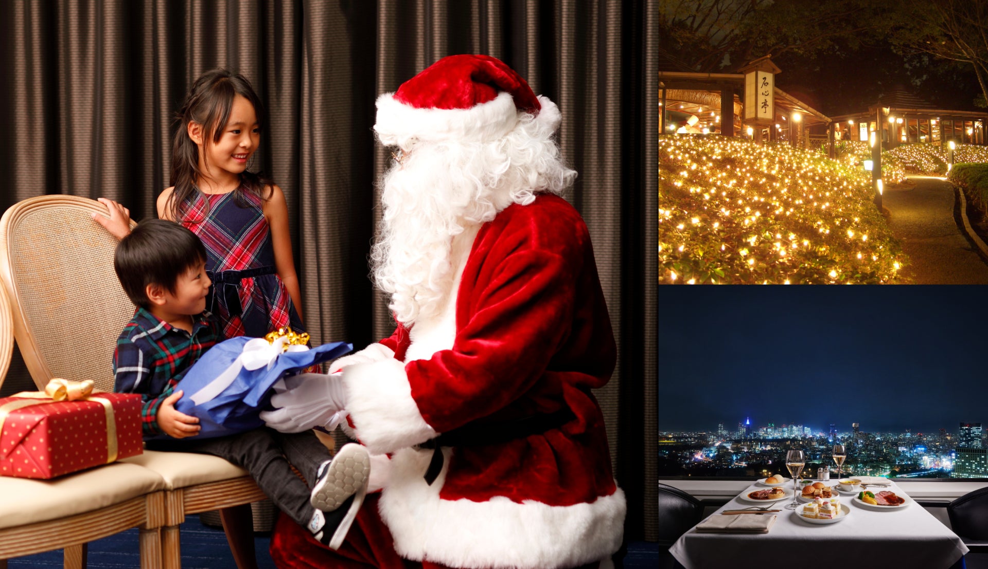 サンタクロースがタワーレストランに登場!お父さまお母さまに代わって、心を込めてお子さまへプレゼントをお渡しいたします。ホテル最上階・地上144mからの絶景とともに、クリスマス期間限定のメニューもお愉しみください。