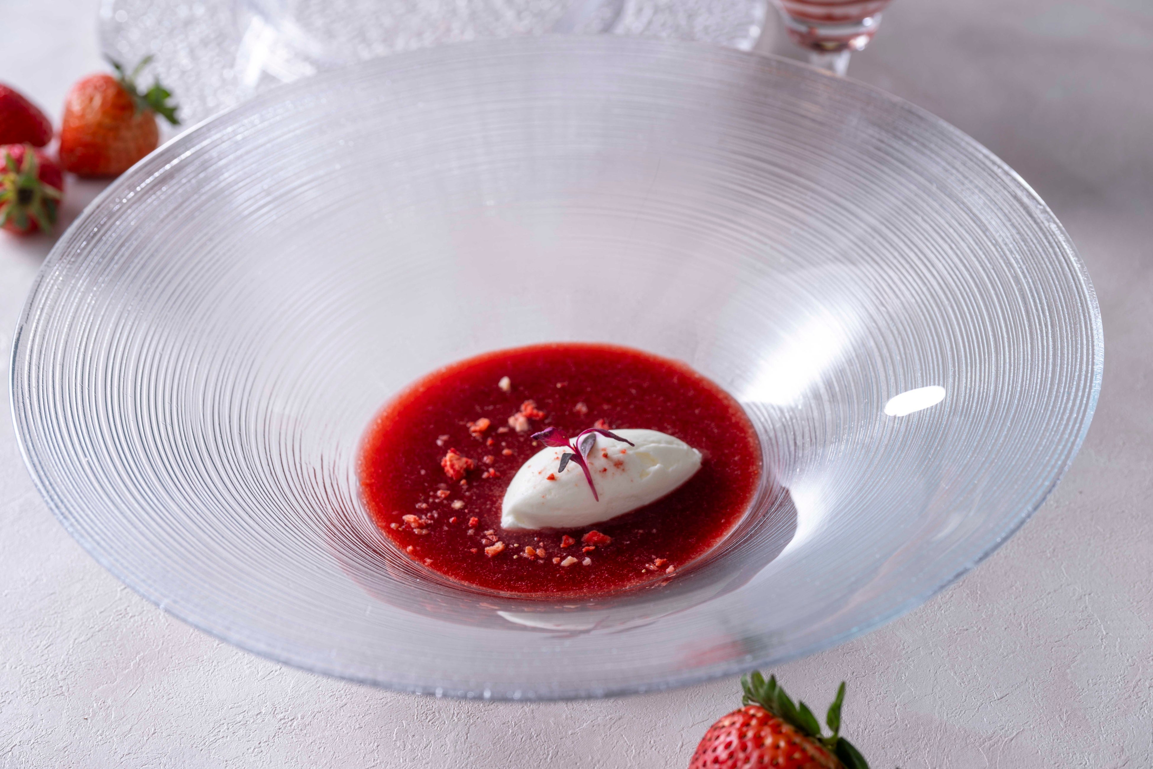 苺とマスカット・ベーリーAのスープ マスカルポーネとゲランド産の海塩を添えて