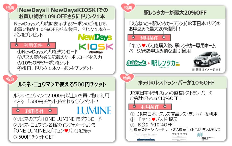 2.キュン♥パス購入者限定 「JRE MALL連携キャンペーン!」 JRE MALL内で利用可能なクーポンをプレゼント! さらに、キュンパス発売期間に使えるお得な電子チケットを期間限定発売!