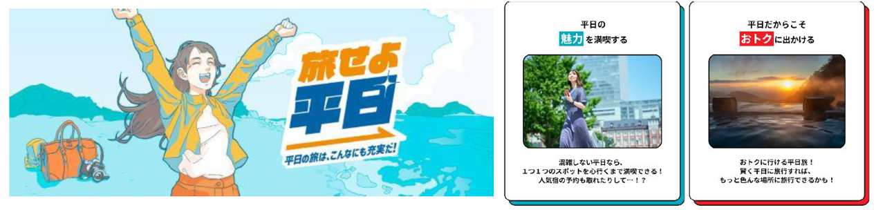 ○JR東日本グループは「変革2027」において「地方を豊かに」をコンセプトに、「地域間」「地域内」の観光流動の拡大を目指します。 ○多くのお客さまに「平日に旅行へ行きたい!」と思っていただけるきっかけとして、平日限定の「おトクな商品」の設定や地域の魅力、旬なイベント情報などを発信し、JR東日本エリアの観光の魅力を体感いただくことから地域の活性化に取り組んでいきます。 |