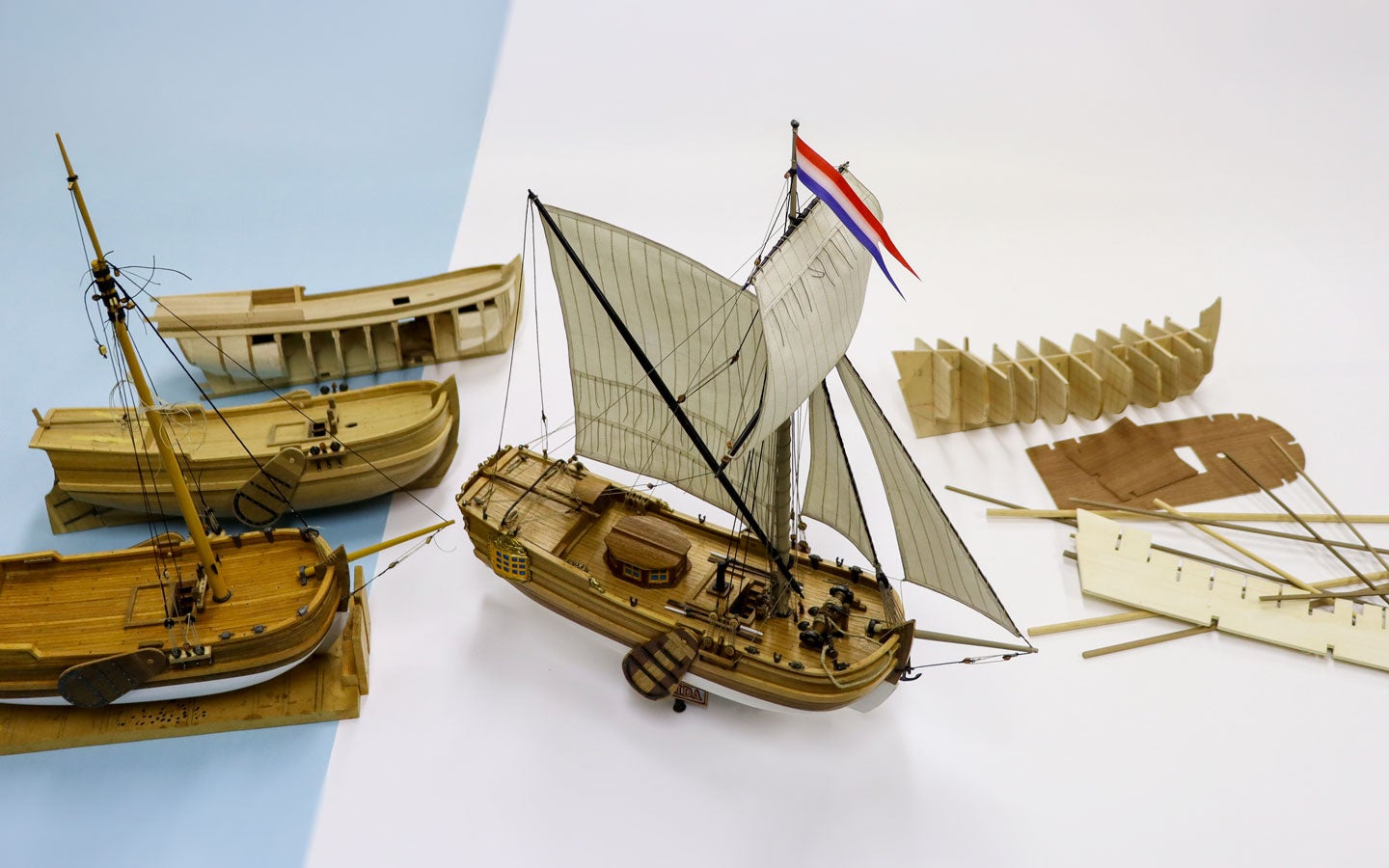 帆船模型の製作工程を、模型パーツの実物やパネル展示で紹介します。