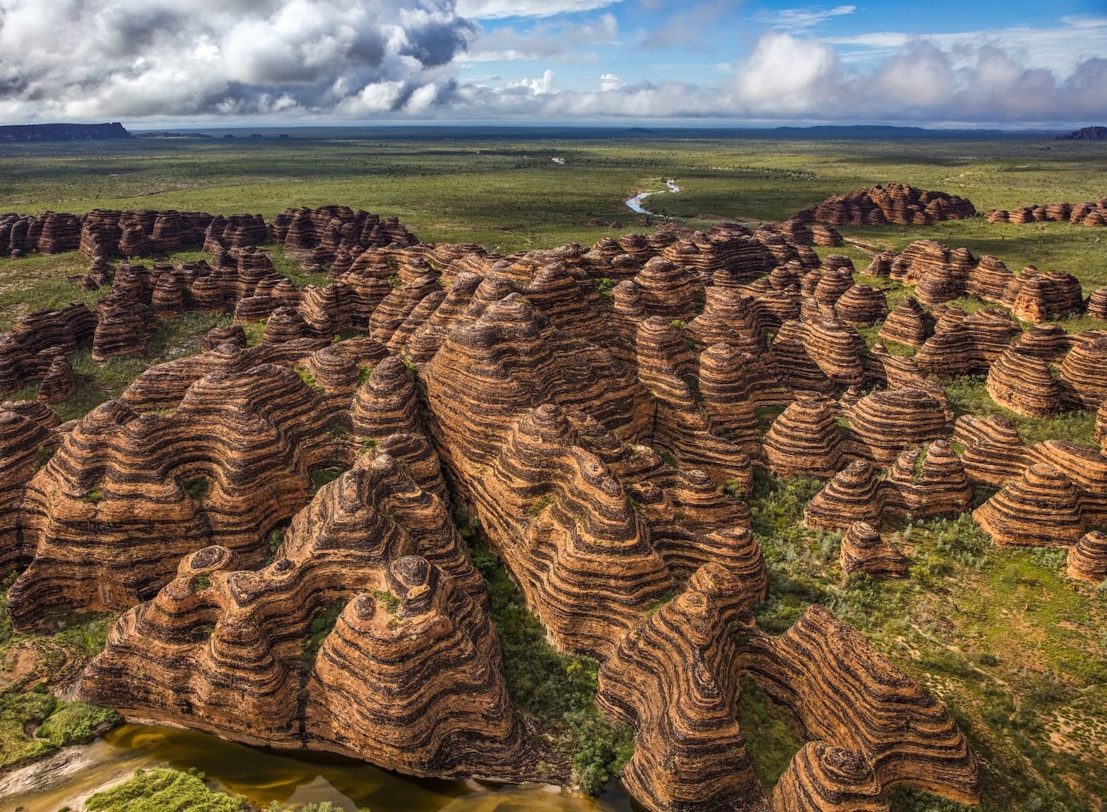 世界最後の秘境の一つと言われる北西部「キンバリー」地域の東部に位置する「パヌルル国立公園」には、世界自然遺産の「バングルバングル」があります。ハチの巣のような奇岩が山脈状に連なるこの奇岩群は、1983年に撮影クルーによって世界に紹介されるまで、先住民族など、わずかな人にしか知られていない秘境でした。オレンジと茶色の縞模様を持つドーム型の砂岩は、約3億5千年前から堆積・隆起し、2千万年をかけて侵食してできたといわれています。「ヘリ・スピリット」が提供する「エアーツアー」では、ヘリコプターの遊覧飛行によってこの大地が生み出した神秘を全く新しい視点で体験でき、上空からの眺めは圧巻です。