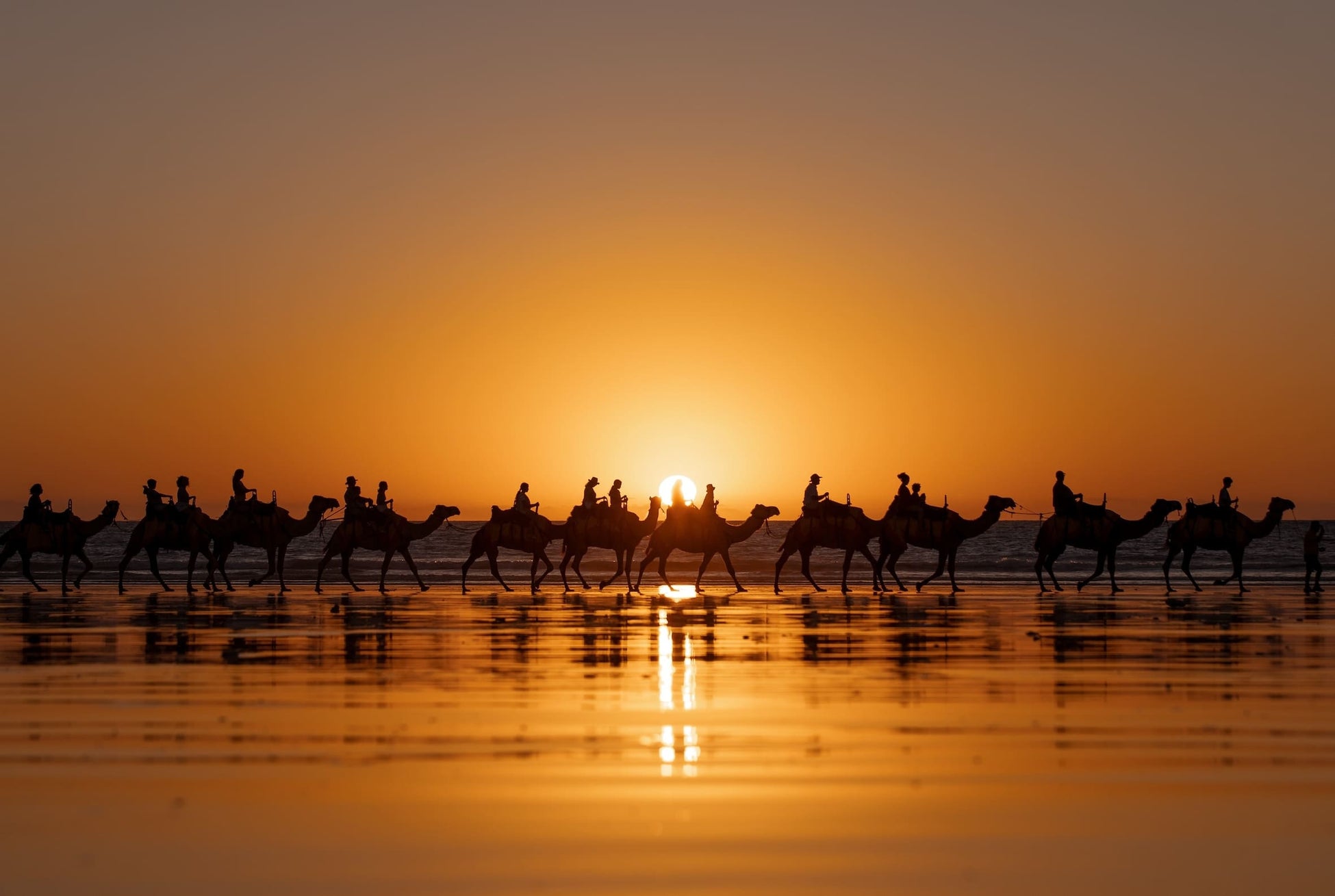 北西部に位置する美しいビーチリゾートの街「ブルーム」は、暖かな日差しと澄み切った青空が広がり、ゆったりとした時が流れます。この街の象徴的なアクティビティが、約22kmの白い砂浜とターコイズブルーの海が広がる「ケーブルビーチ」でのキャメルライドです。特に夕暮れ時は、空一面がピンク、パープル、オレンジに染まり、その幻想的な瞬間をラクダの背に揺られながら見届ける特別な体験ができます。「ブルーム・キャメル・サファリ」では40年以上の経験を持つオペレーターによるキャメルライドツアーを提供し、初めての方でも安心して体験することができます。