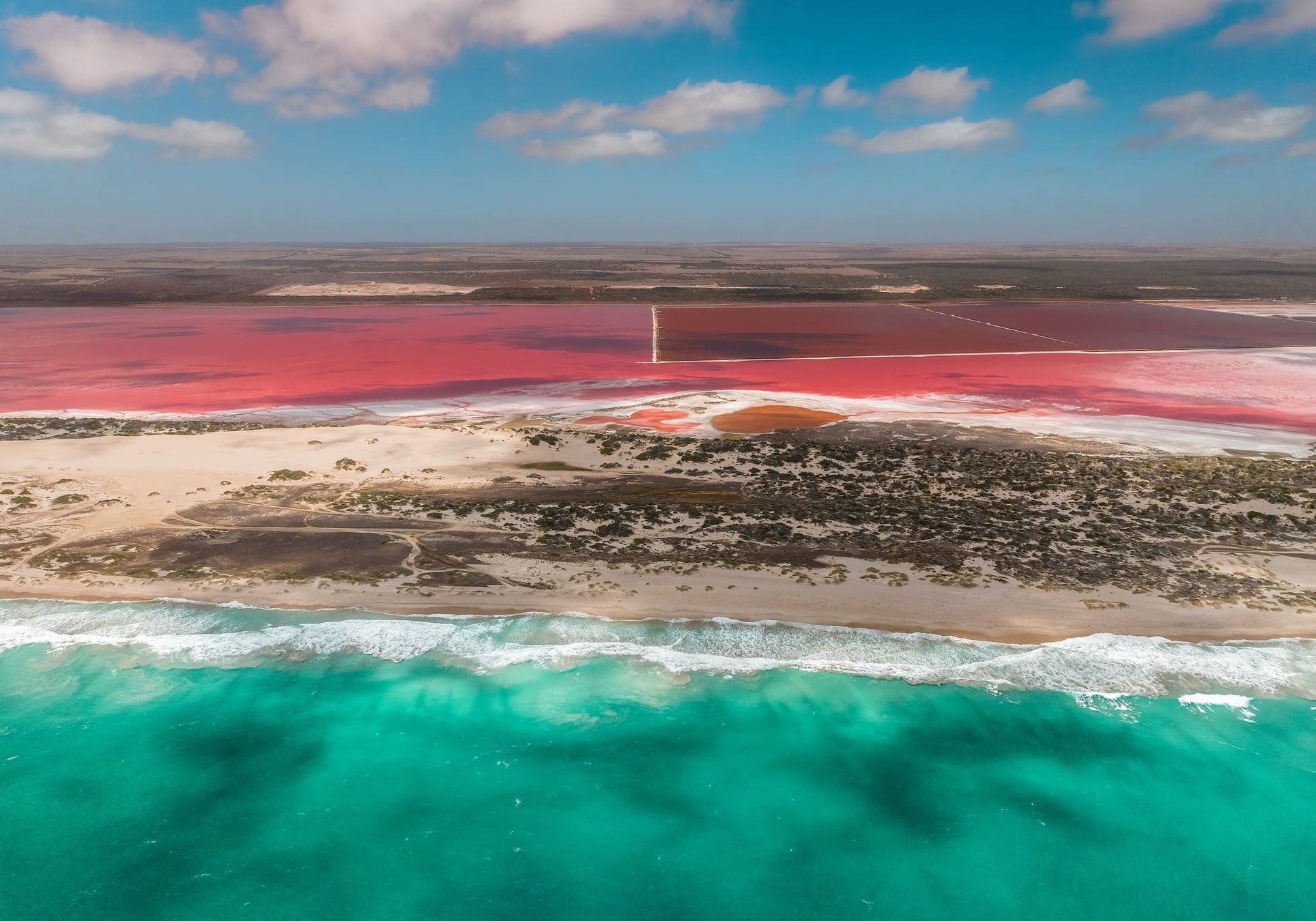 「パース」からインディアンオーシャンズドライブを約6時間北上すると、ピンク色の湖「ハットラグーン」が広がります。食品着色料にも使われるカロテノイドを生成する藻類「ドナリエラ」によって湖がピンク色に染まり、バブルガムピンクやライラックなど、時期によって色の変化を楽しむこともできます。「スケニック・フライト」の遊覧飛行ツアーでは、カルバリー空港から小型飛行機で飛び立つ45分間のフライトで、ターコイズブルーのインド洋と、「ハットラグーン」のピンクの鮮やかなコントラストや、赤い堆積岩の色合いが美しい海岸の断崖を眺める優雅なひとときを味わえます。