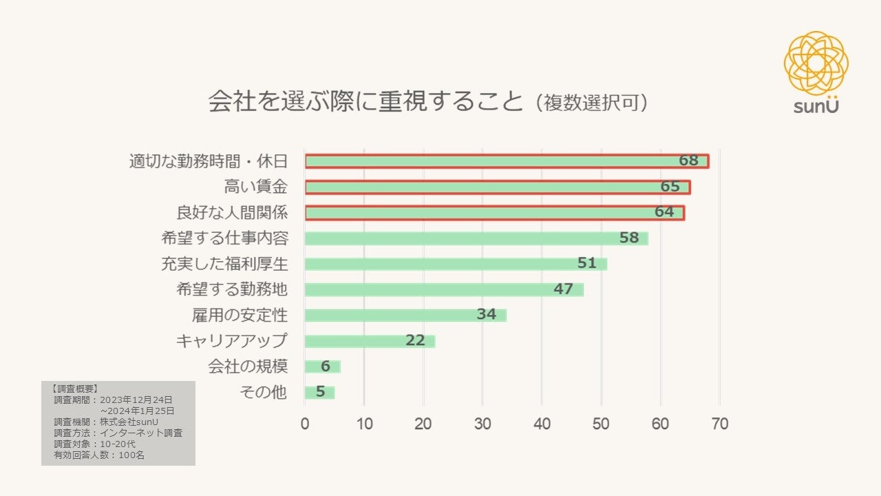 株式会社sunU(本社:東京都江東区、代表取締役:伊東優)は、今後の宿泊業界を担う10代~20代の男女100名を対象に、働き方とSNS利用に関する調査を実施いたしました。