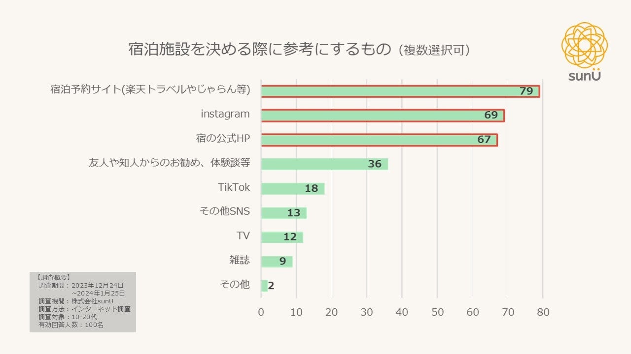SNSの中では「Instagram」が最も多く利用されており、宿泊先を決める上で重要な情報源となっていることが分かります。
