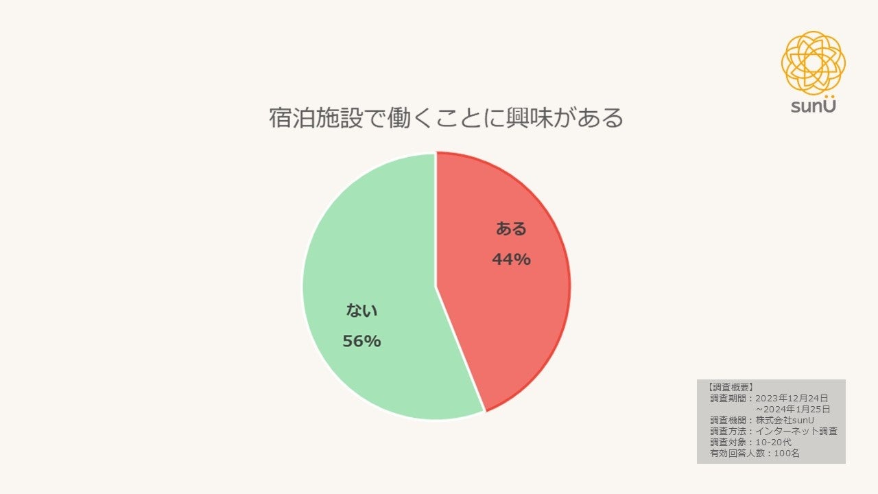 10代~20代の4割以上が宿泊施設で働くことに興味を持っていることが分かりました。