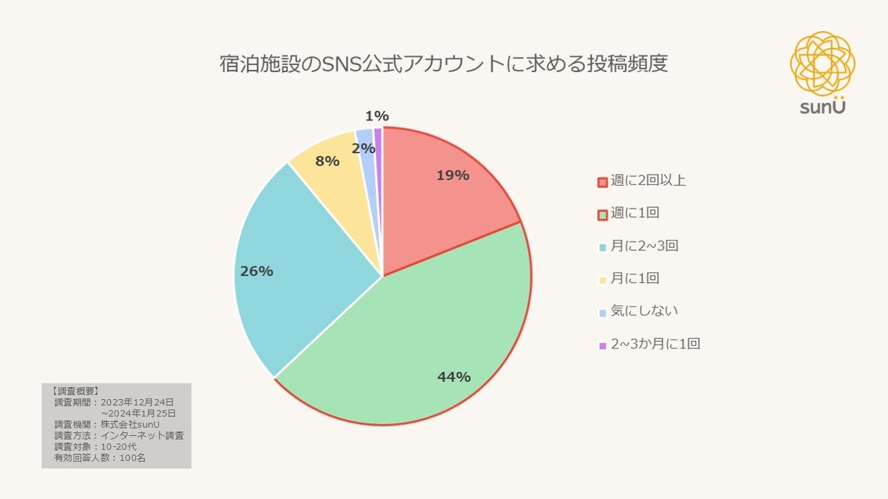 宿泊施設の公式SNSアカウントの投稿頻度について、最も多い回答は「週に1回」で、44%を占めています。次いで「月に2~3回」が26%、「週に2回」が19%と続いています。