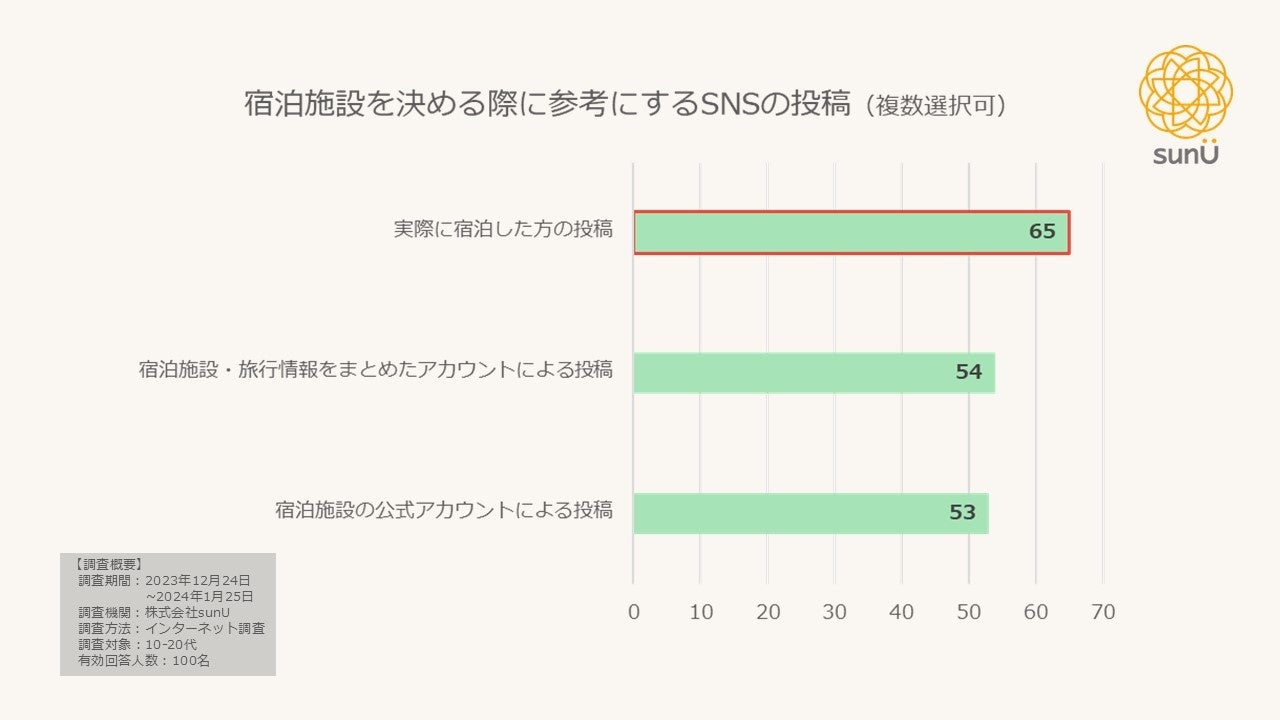 宿泊施設側は、公式アカウントでの情報発信だけでなく、宿泊客の口コミやインフルエンサーとの連携を強化することで、より効果的に若者層へのアプローチを行うことができると考えられます。
